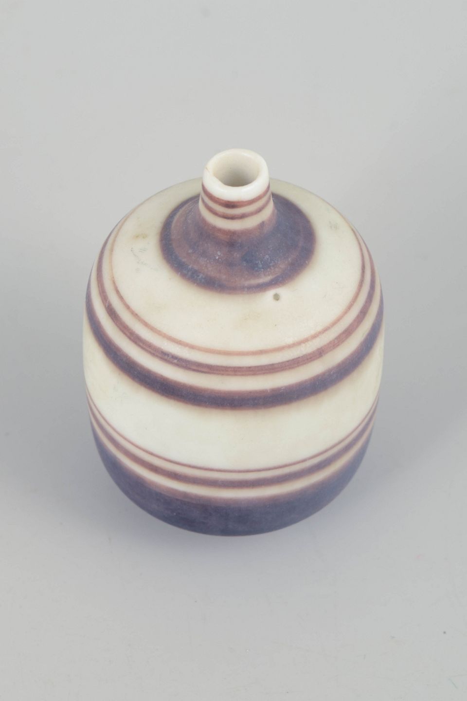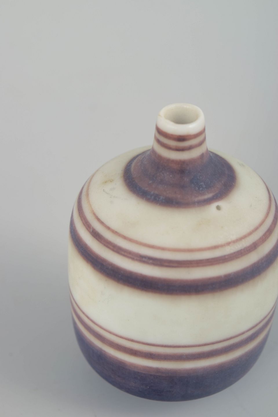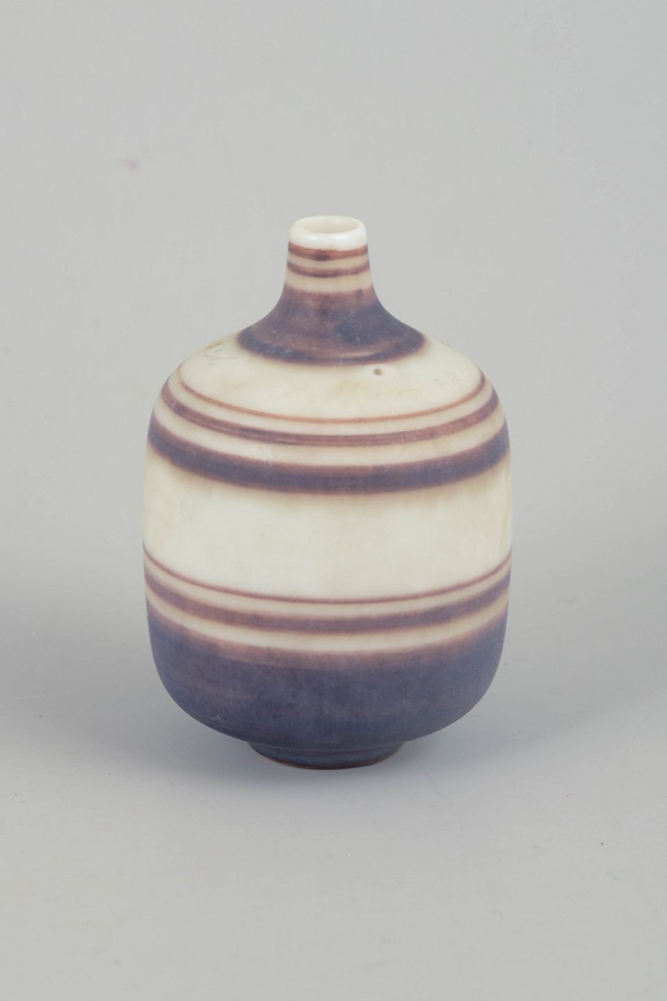 Hånddrejet miniaturevase i stentøj med karakteristiske, bløde stribede dekorationer i violette og cremefarvede nuancer. En elegant lille form med Nylunds velkendte sans for proportioner og taktile overflader.