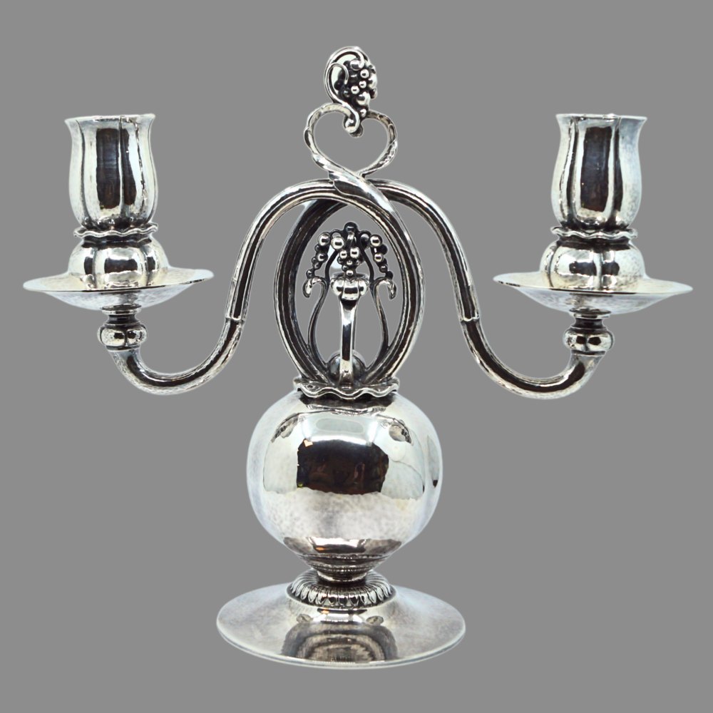 Georg Jensen; Massiv to armet kandelaber i hamret sterling sølv, prydet med druer og granatæble. Designet af Georg Jensen omkring 1914-1918. Dessin nr. 324.