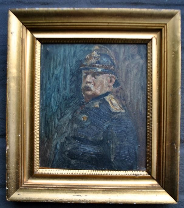 Hansen, Hans Nicolaj (1853 - 1923) Danmark: Portræt af Vicebranddirektør, kaptajn August Carlsen. Olie på pap. Værket er verso betegnet 1891. 19 x 16,5 cm.