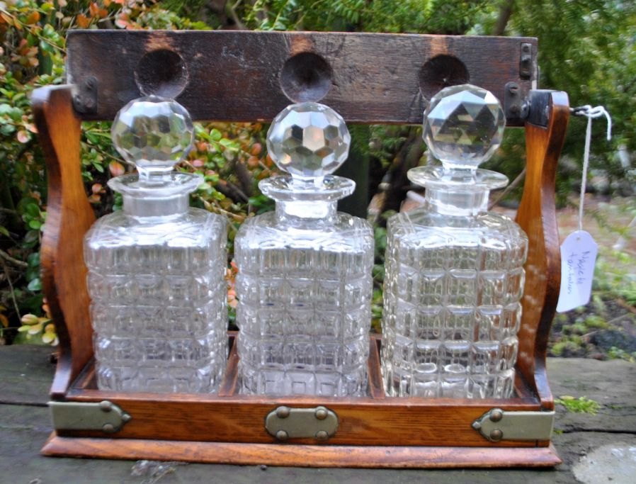 Engelsk tantalus med tre krystal karafler, 19. årh.