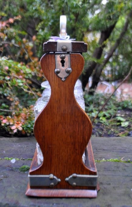 Engelsk tantalus med tre krystal karafler, 19. årh. Poleret egetræ. Med messingbeslag og lås med nøgle. H: 31 cm. L: 34 cm.