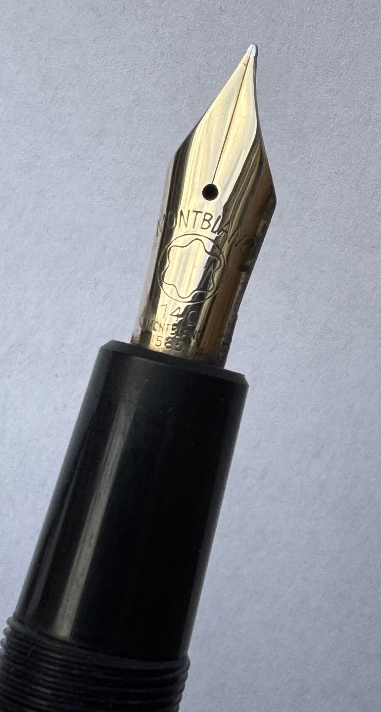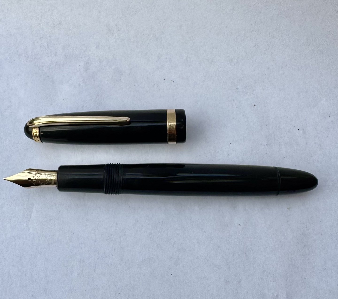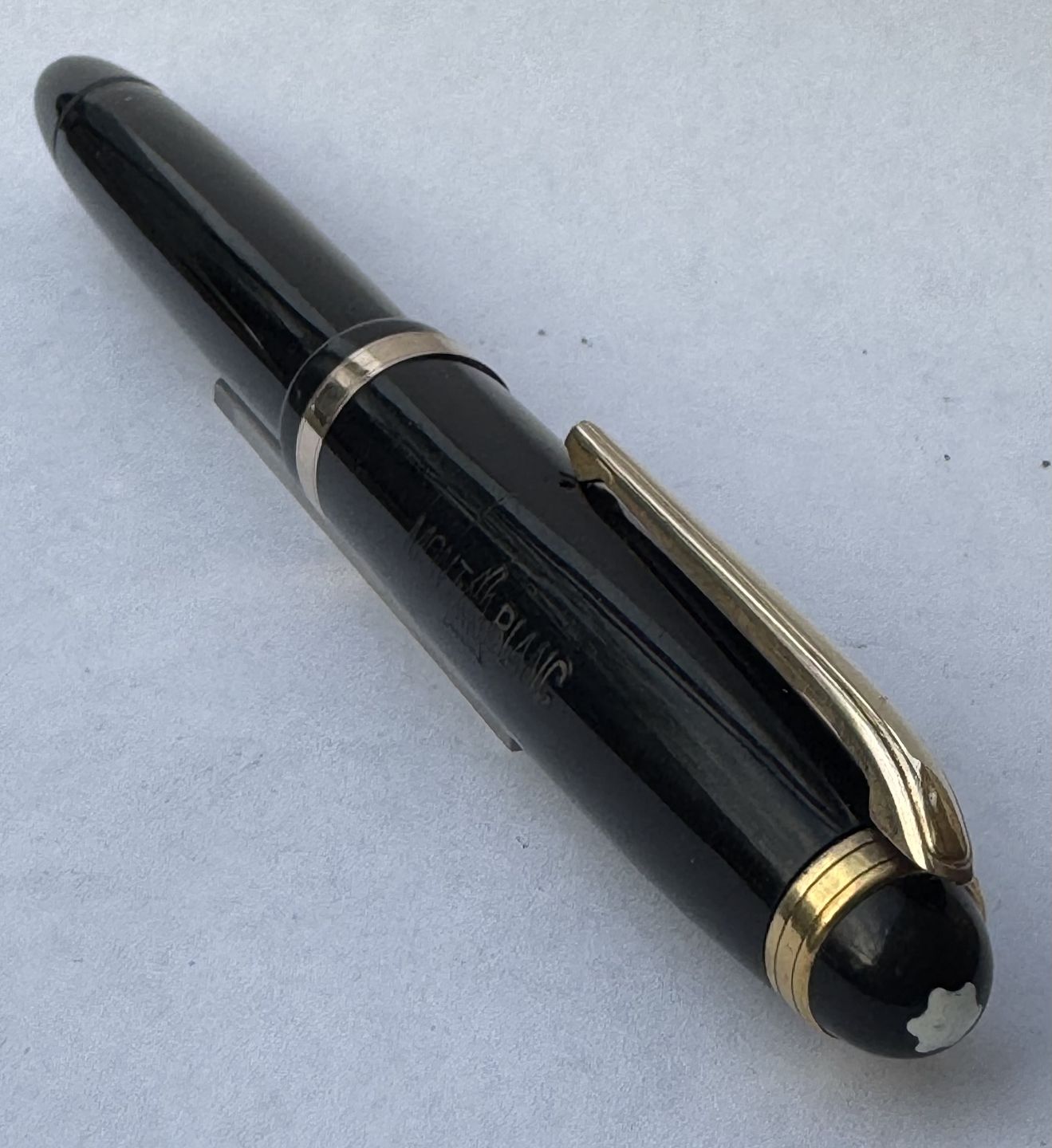 Sort Montblanc no. 216 fyldepen. Push button blæk-påfylder. Fremstillet i Tyskland. i 1950´erne. Fremstår i god stand uden skader eller reparationer. Alle originale Montblanc dele inclusive den flotte 14 karat guldspids. Der skal indsættes en ny gummisæk så pennen igen kan optage blæk og skrive igen. Mål: Længde 13,7 cm.