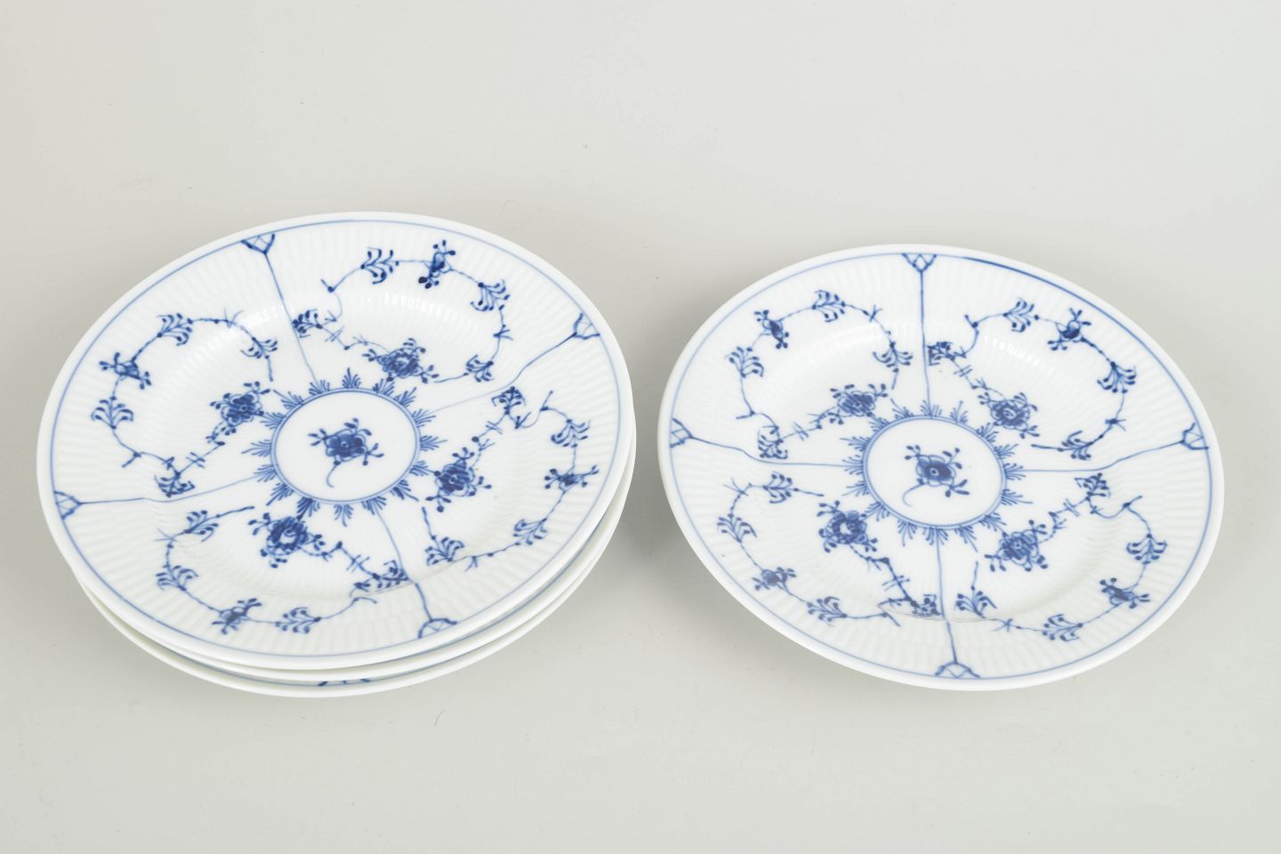 Sæt bestående af fire tallerkener i Musselmalet Riflet. Tallerkenerne er udført i den klassiske riflede form uden blondekant og dekoreret med håndmalet koboltblå underglasur. Et tidløst og anvendeligt sæt, velegnet til både salater og mindre anretninger.