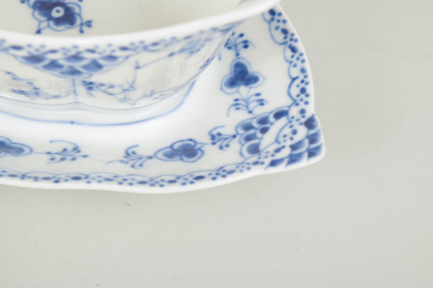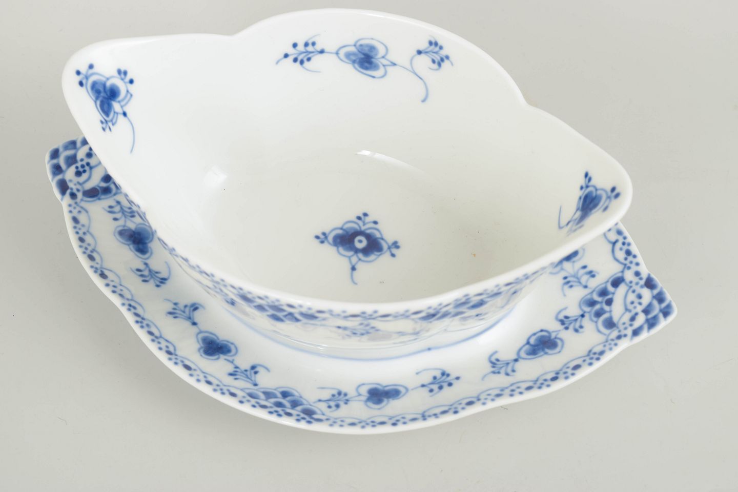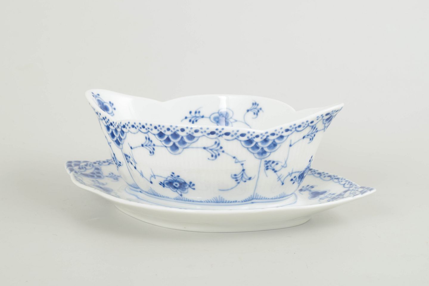 Klassisk sauciere i Musselmalet halvblonde med tilhørende fast underfad. Udført i riflede former med blondekant og håndmalet koboltblå underglasurdekoration. En elegant og funktionel serveringsdel, velegnet til saucer og tilbehør.
