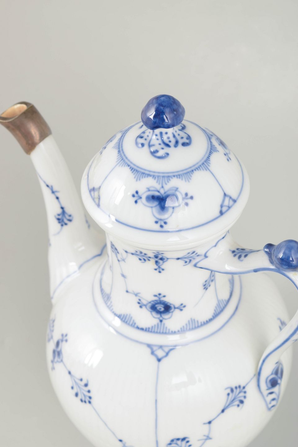 Klassisk kaffekande i Musselmalet riflet, udført i riflede former uden blondekant og dekoreret med håndmalet koboltblå underglasur. Tuden er forsynet med en sølvmontering, antageligt udført for at afdække et mindre afslag. En funktionel og æstetisk løsning, som historisk blev anvendt for at forlænge genstandens brugstid.