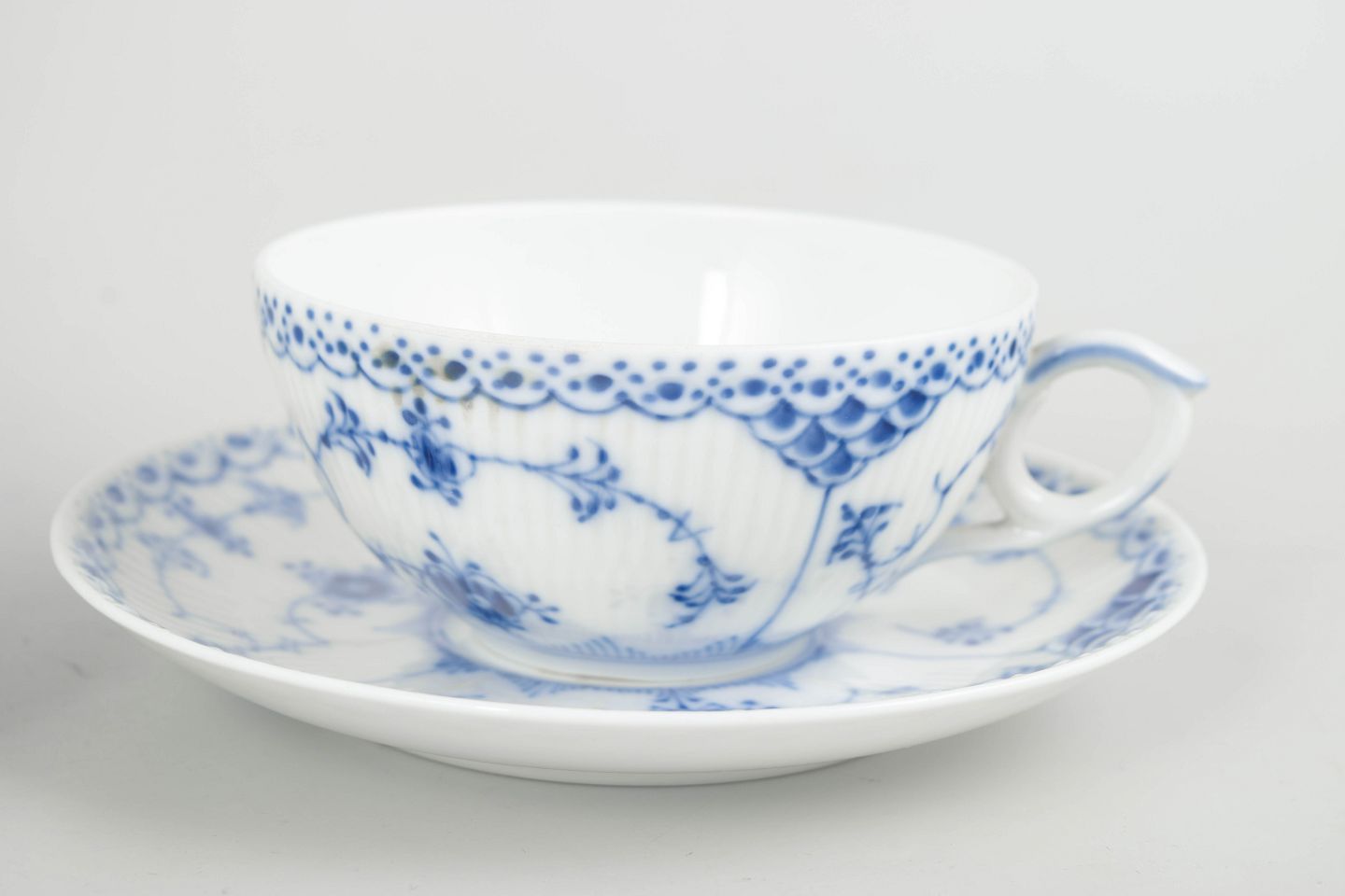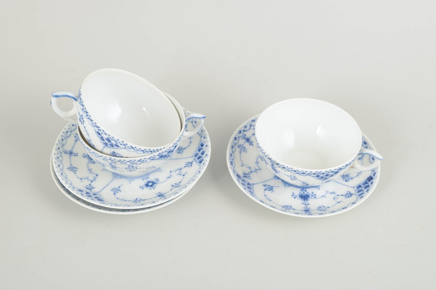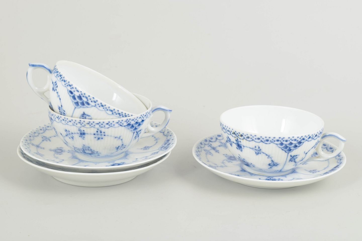 Sæt bestående af 3 tekopper med tilhørende underkopper i Musselmalet halvblonde. Klassiske riflede former med blonder og håndmalet koboltblå dekoration. Et harmonisk og anvendeligt tesæt fra sen produktion.