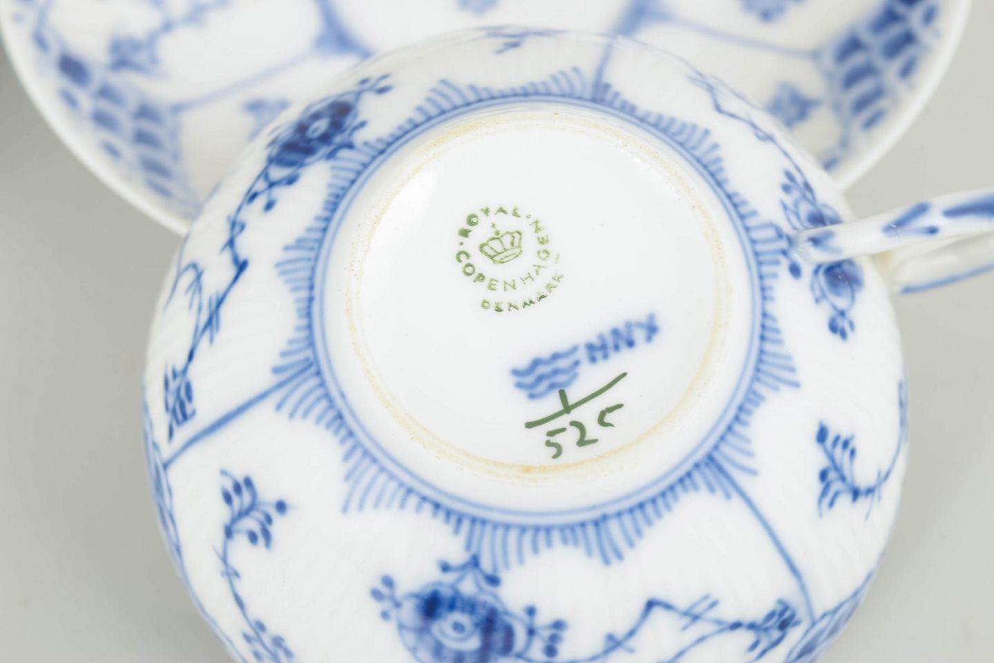 Musselmalet halvblonde blev introduceret i 1885 som en mere dekorativ udgave af det klassiske musselmalede stel. Tekopper med underkopper har været en central del af Royal Copenhagens teservicer gennem generationer.