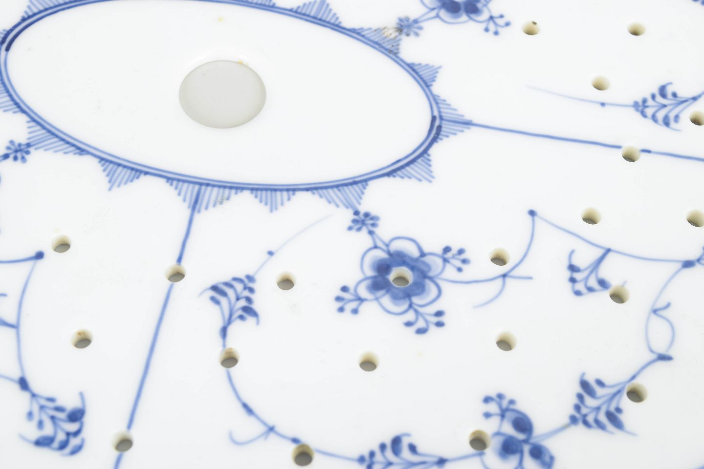 Antik fiskerist i klassisk Musselmalet Riflet-dekoration. Den ovale, riflede form er opdelt af fine gennembrudte felter og dekoreret med håndmalet koboltblå underglasur i det karakteristiske musselmalede mønster. Et både funktionelt og elegant serveringsstykke fra Royal Copenhagens tidlige produktion, udført med stor teknisk kunnen og harmonisk balance.