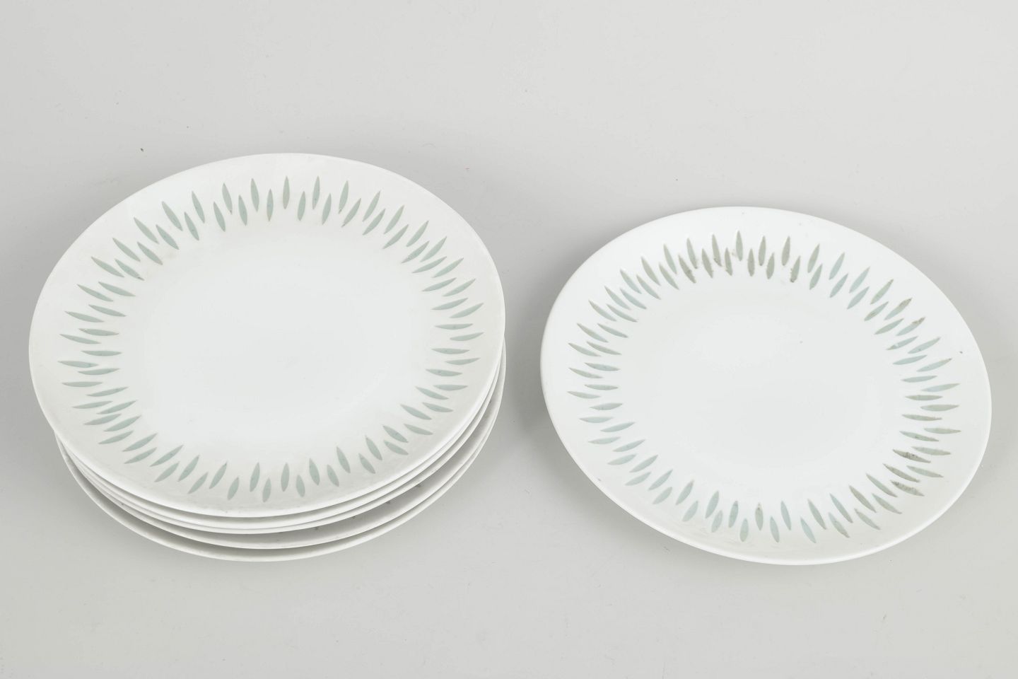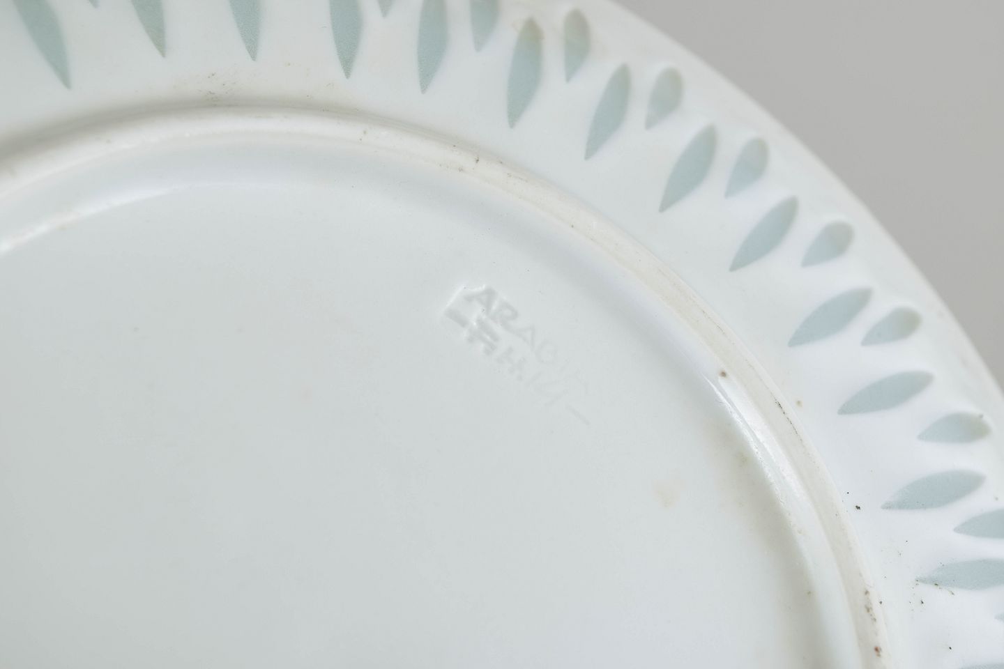 Sæt bestående af seks tallerkener i hvidt porcelæn dekoreret med karakteristisk “rice porcelain”-ornamentik langs fanen. De aflange, transparente glasurfelter danner en let og rytmisk bort, som giver tallerkenerne et elegant og luftigt udtryk. Det enkle formsprog er typisk for Friedl Holzer-Kjellbergs sene porcelænsdesign for Arabia.