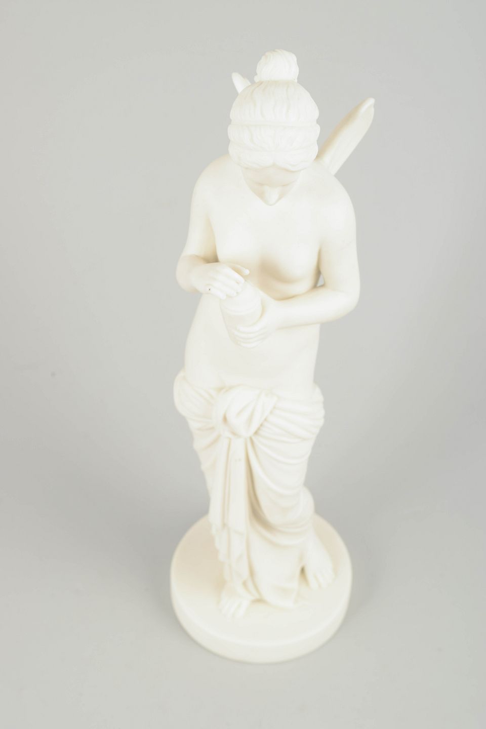Biscuitporcelænsskulptur forestillende Psyche, den mytologiske ånd og sjælens gudinde. Figuren er udført i uglaseret, mat porcelæn med klassicistisk formsprog, fine anatomiske detaljer og blødt modelleret draperi. Psyche er afbildet stående med vinger og et lille kar i hænderne. Produceret hos Gustavsberg omkring år 1900.
