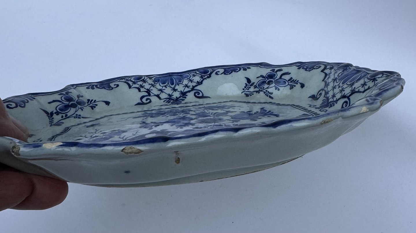 BLÅ BLOMSTER DEKORATION: Delft fajance fiskefad fra den nederlandske fabrik van Duyn fremstillet omkring 1765. Fremstår i god stand med alders relaterede brugsspor rundt på kanten i form af små overflade afslag i glasuren (se mange fotos). Der udover ingen skader eller reparationer. Fabriksmærket på bunden samt gammel label med dansk tekst. Mål:H.3,4 cm, L. 23,3 cm, D. 20,9 cm