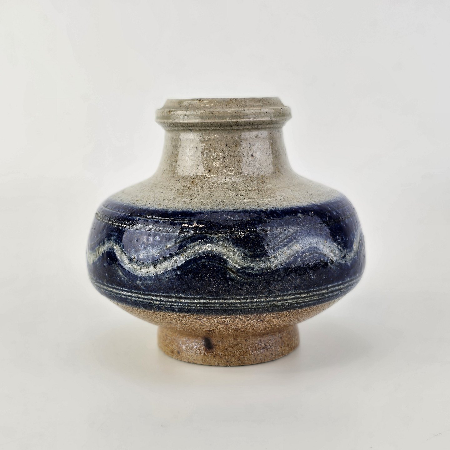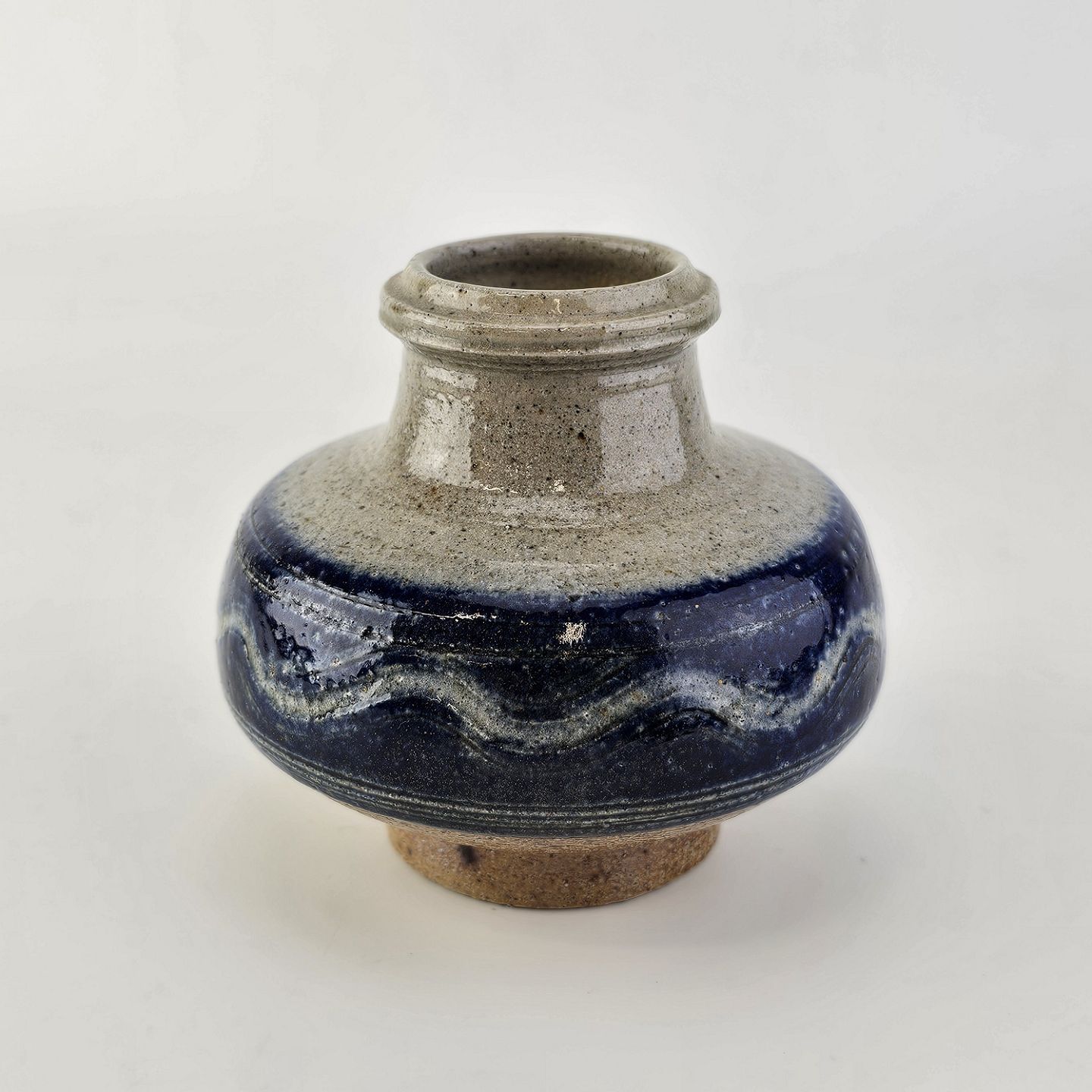 Vase smal fod og topi grå glasur, og bred midt for i blålig farve