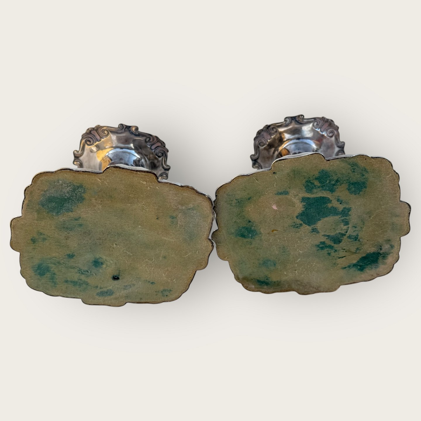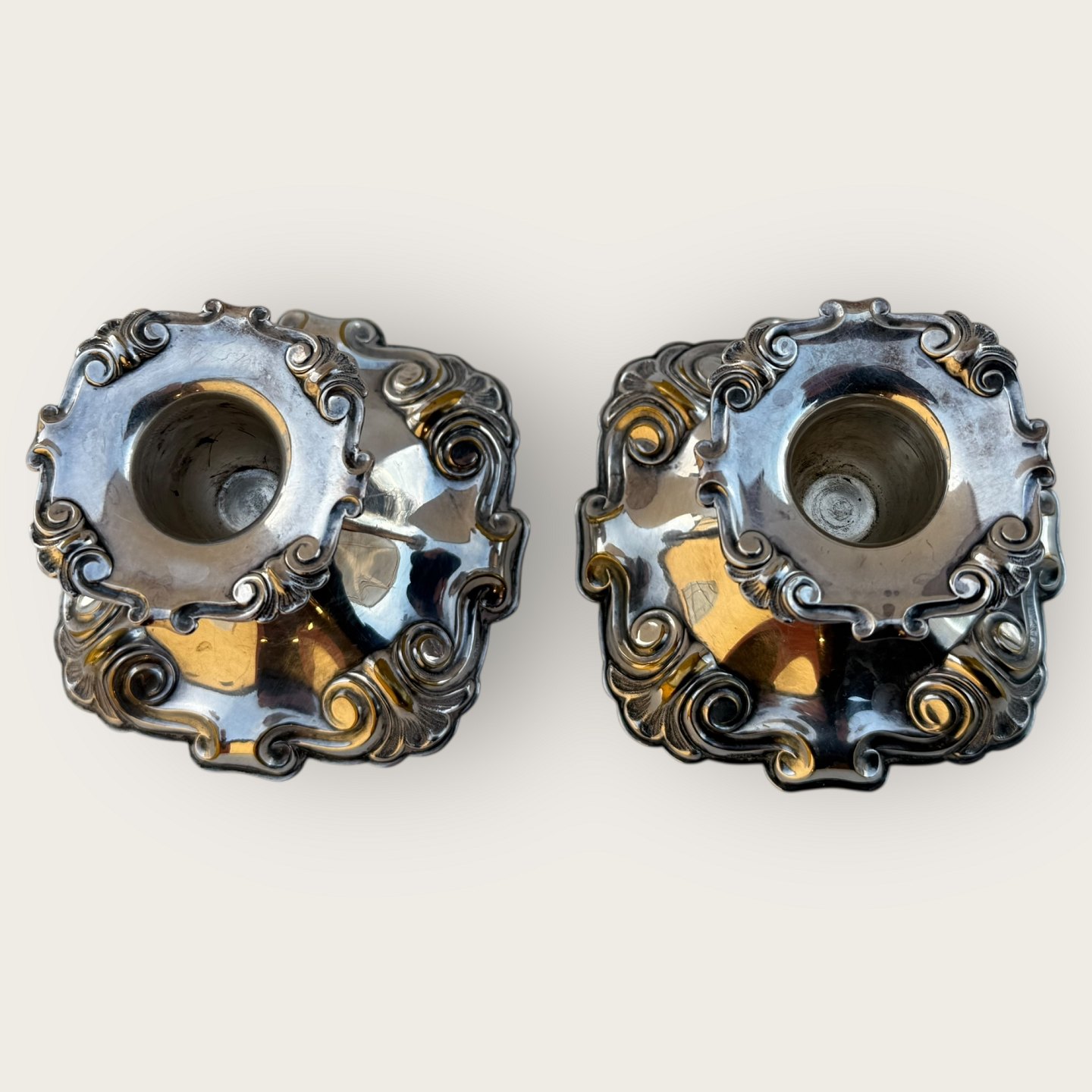Cohr sølvvarefabrik, et par lysestager i sølvplet udfyldte i bunden, højde 6,5cm * Lidt slid på forsølvningen ellers pæn brugt stand*