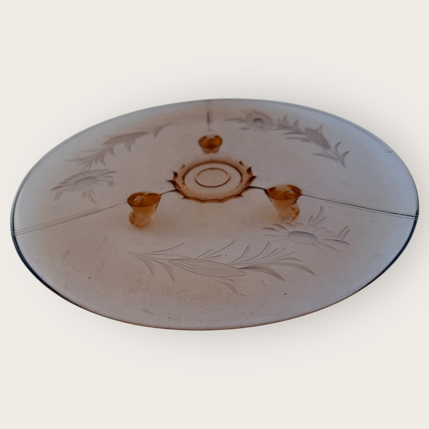Rosa glasfad med blomsterslibninger og tre fødder, diameter 29cm *pæn stand*