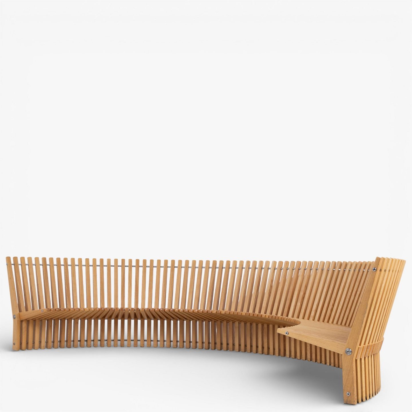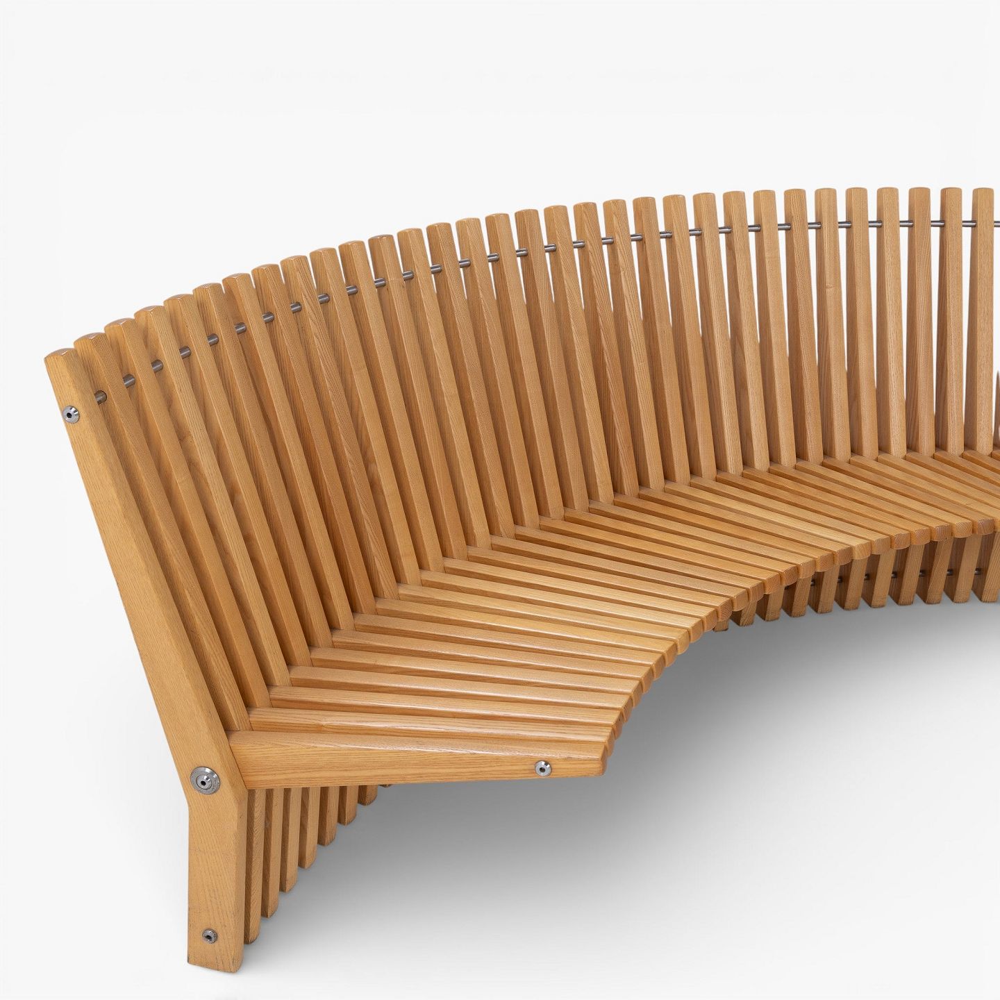 'Astral'-bænk i massiv patineret elmetræ i form af en halvcirkel. Formgivet i 1979.