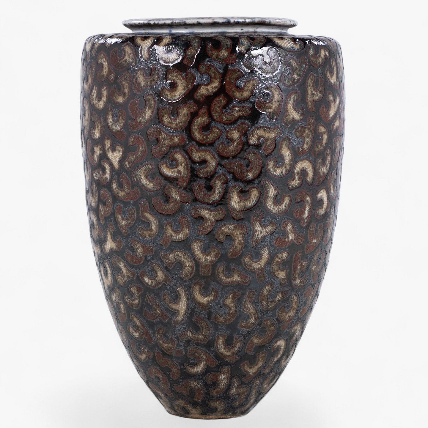 Kolossal krukke i stentøj med sort glasur og røde stafferinger. Signeret.