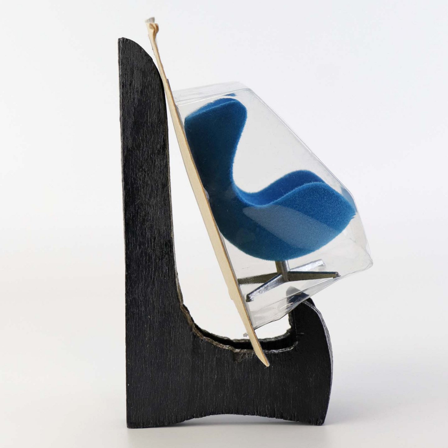 Blå miniature stol til dukkehus med model af Arne Jacobsen's lænestol Ægget. Model 31840/30