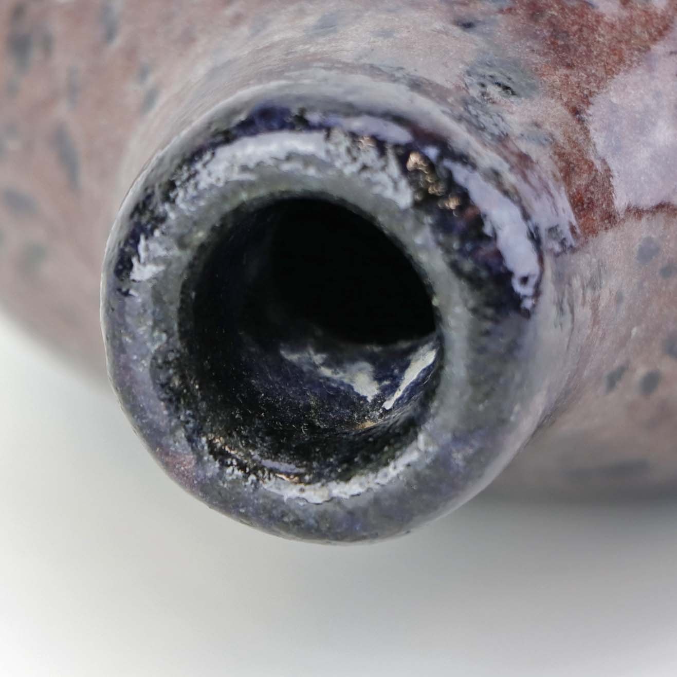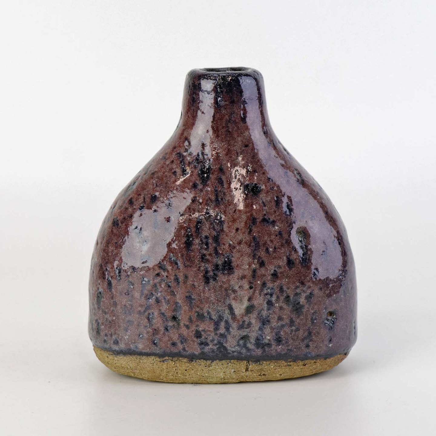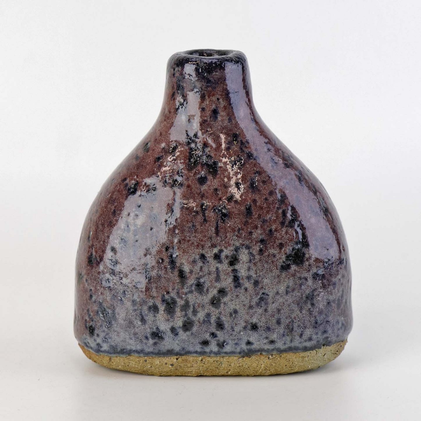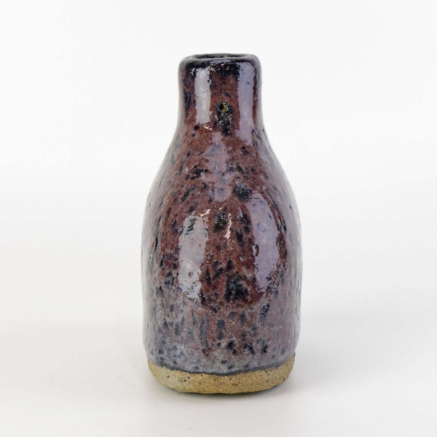 Lille flaskeformet vase i keramik med blommefarvet glasur.