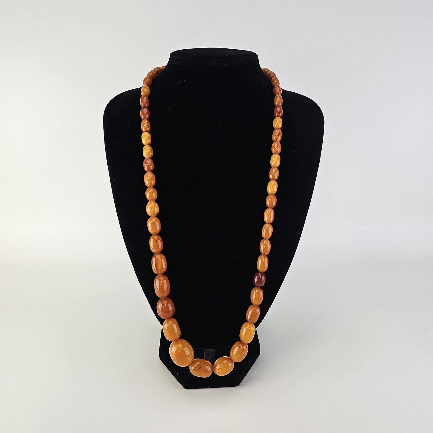 Halskæde med perler af glatslebet rav i varierende størrelse på snor, i alt 54 stykker rav