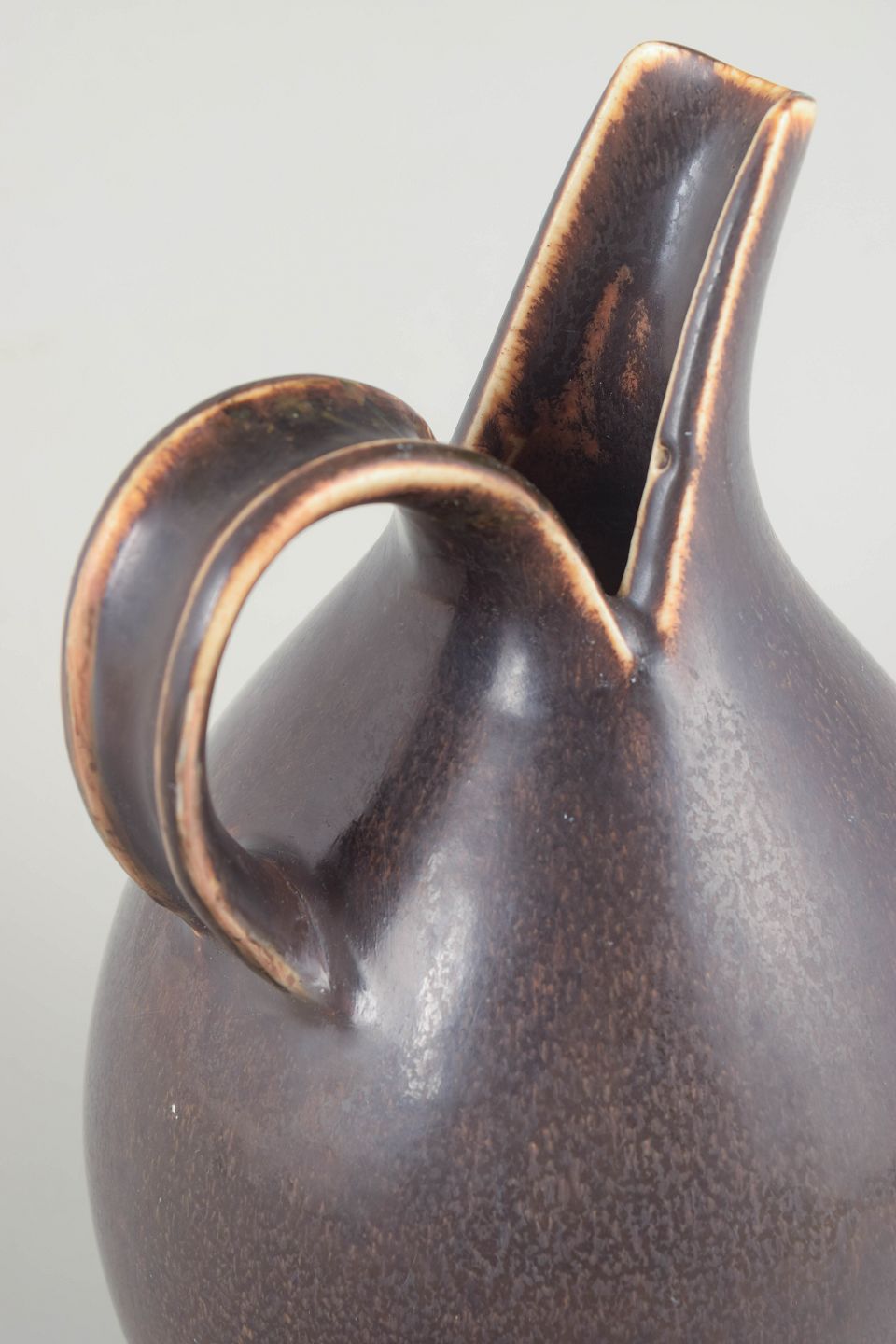 Sjælden og stor spaltekande i stentøj med karakteristisk organisk, pæreformet krop, markant tud og integreret hank. Udført med Saxbos klassiske matte til let skinnende glasur i dybe brunlige toner med subtilt farvespil. Formen fremstår skulpturel og velafbalanceret og repræsenterer Saxbos mest eftertragtede udtryk.