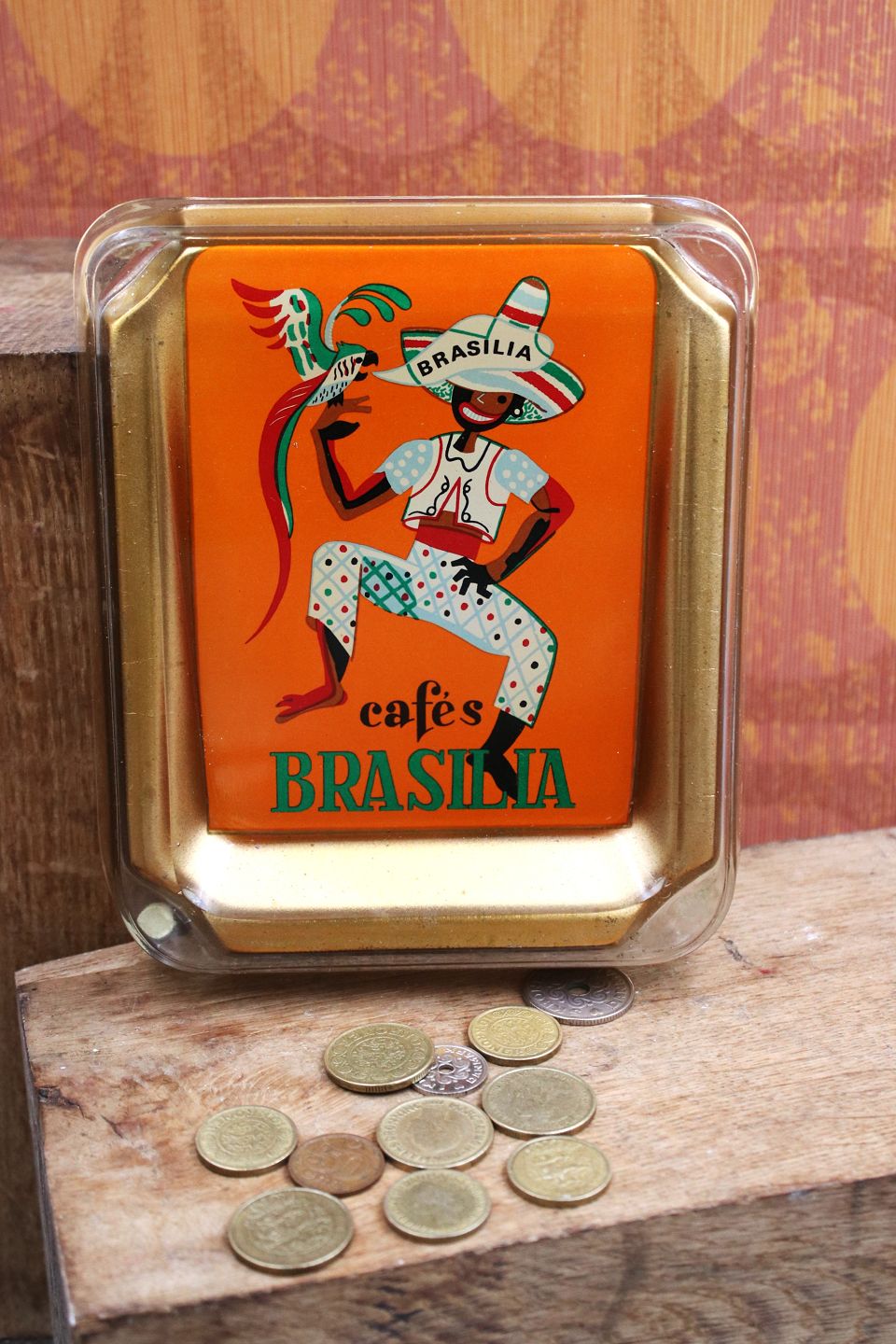 Gammelt penge fad fra kaffebar i 50/60erne i kraftigt glas med motiv af brasiliansk mand med papegøje...