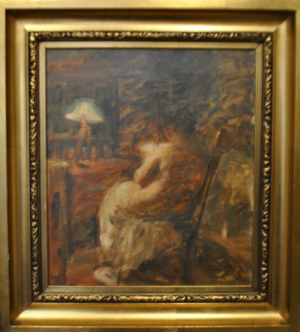 Paulsen, Julius (1860 - 1940) Danmark: Lampelys, interiør. Olie på lærred. Signeret. 38 x 33 cm.