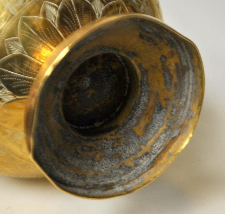 Stor indisk messing vase med hank, ca. 1950. Med indgraverede dekorationer af jagtselskab på elefanter på tiger jagt. På siden ses 4 tigre. Desuden indgraverede blomstermotiver. 32 cm. H.: 21 cm.
