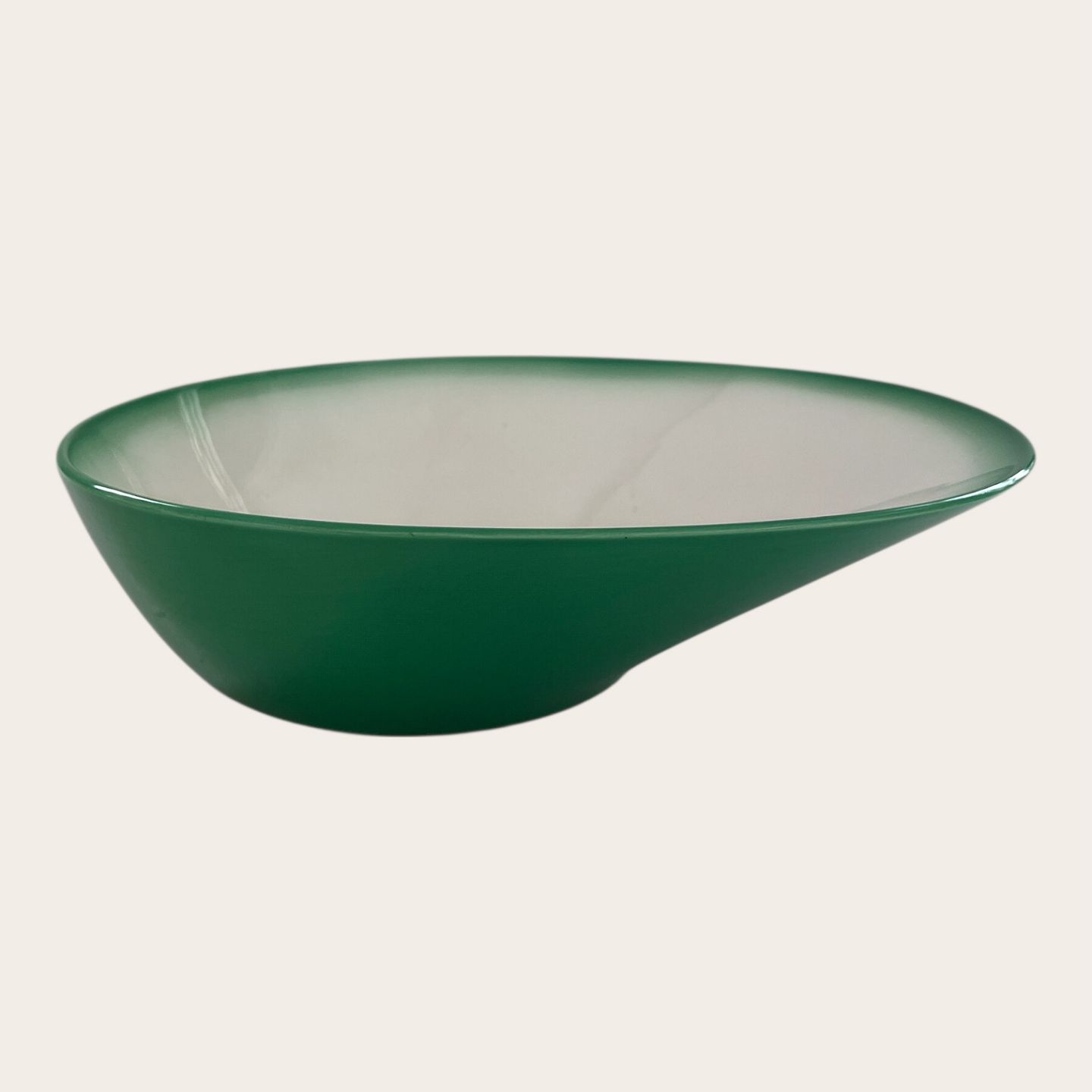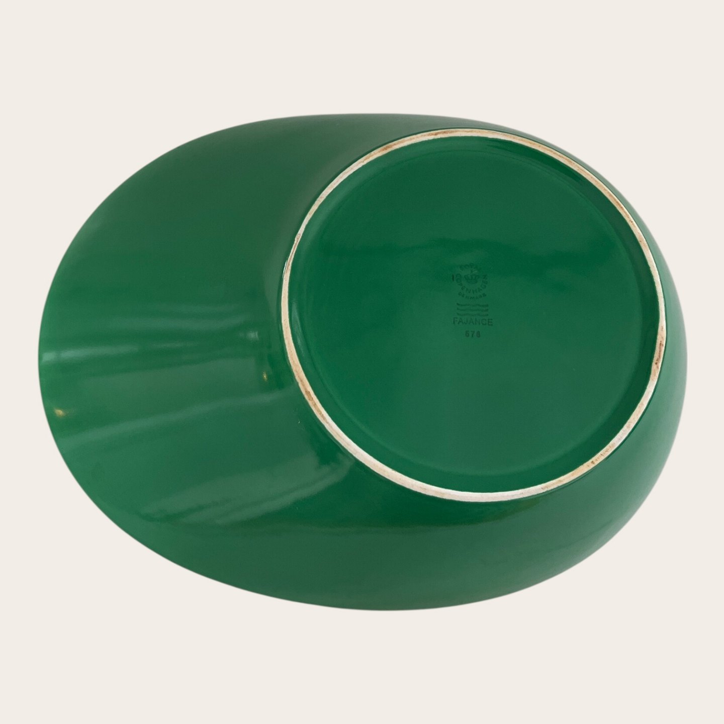 | Royal Copenhagen, Aluminia, Ursula, Asymmetrisk skål, Grøn / hvid, 1. sortering, 30,5cm lang, 24cm bred, 8cm høj, Design Ursula Munch Petersen *Med brugsspor*