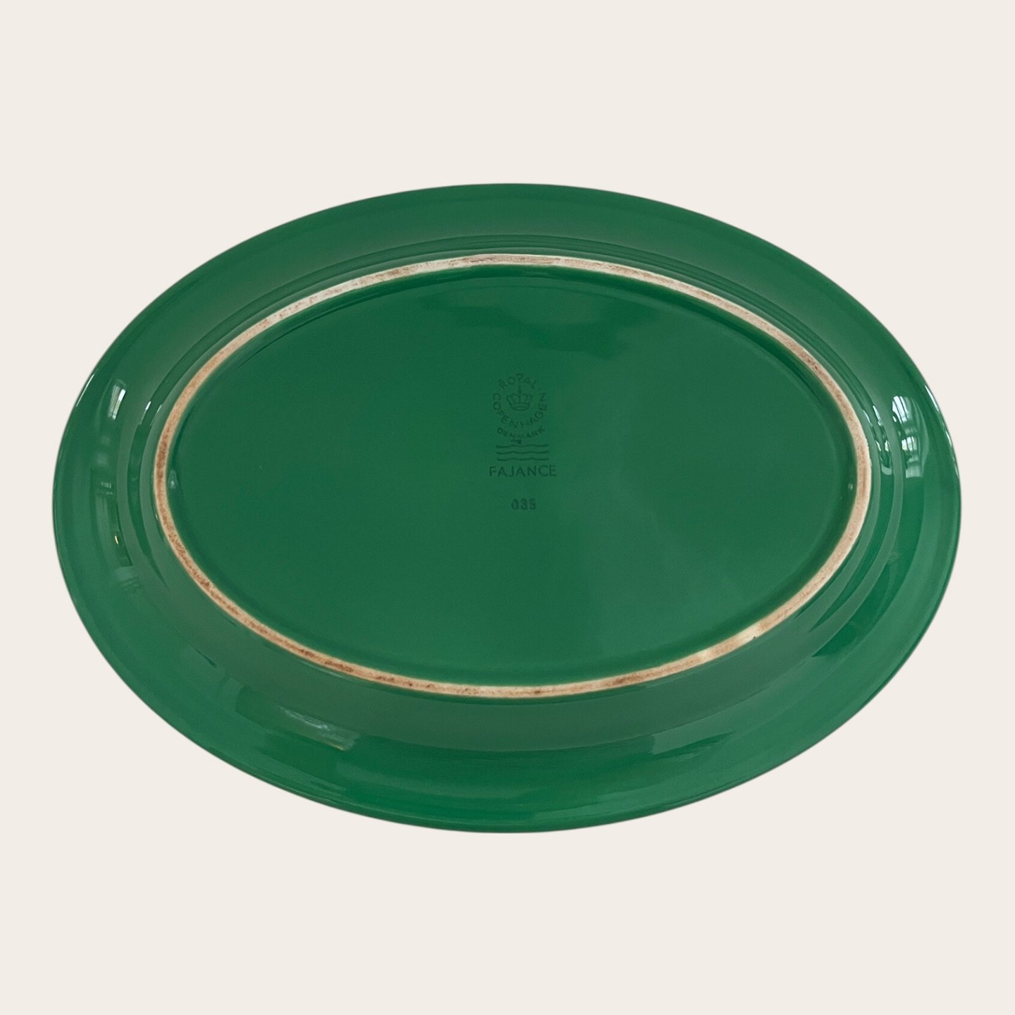 Royal Copenhagen, Aluminia, Tallerken #085, Grøn, 22cm lang, 16cm bred, Design Ursula Munch Petersen *Pæn stand med lette brugsspor*