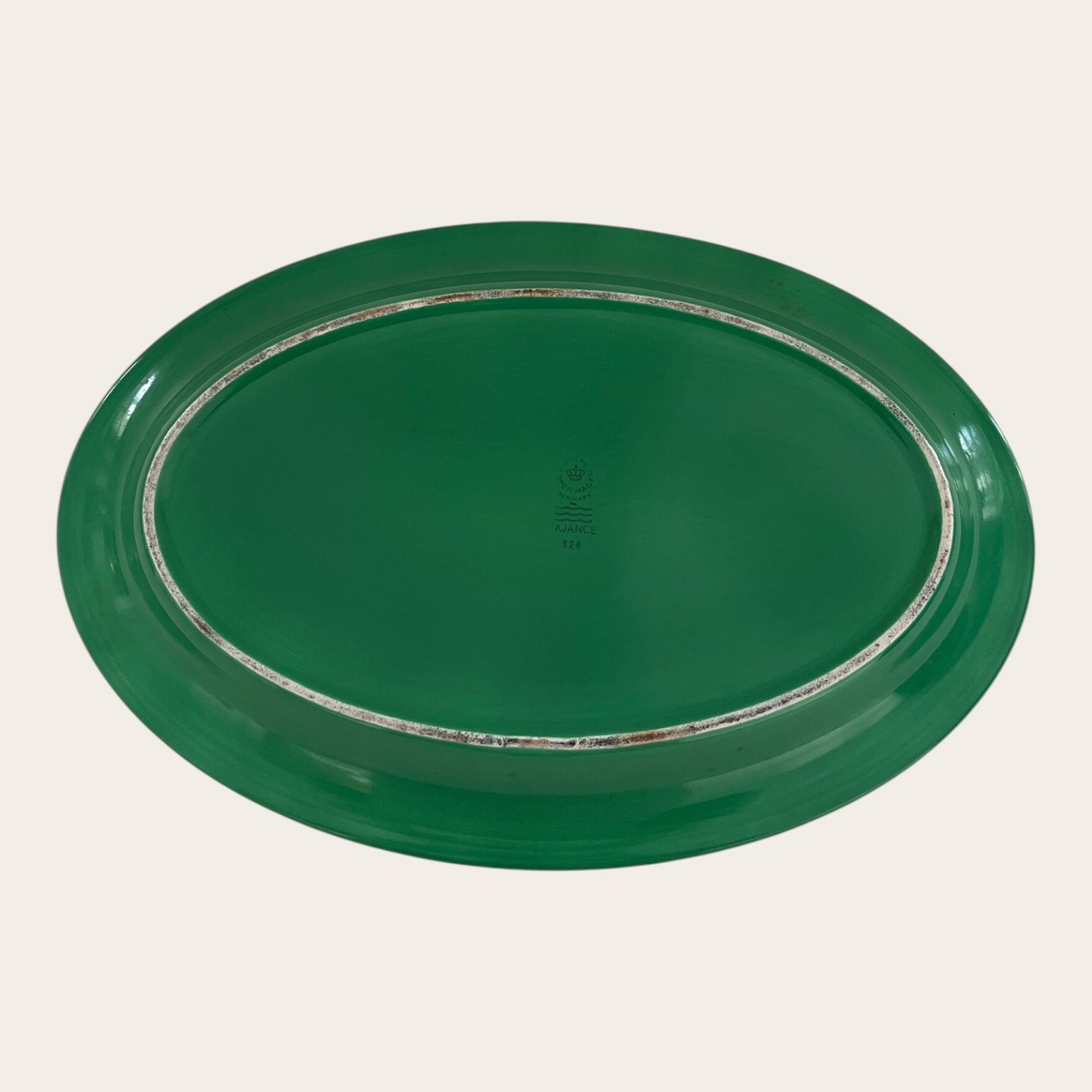 | Royal Copenhagen, Aluminia, Tallerken, Grøn #624, 1. sortering, 33,5cm lang, 22cm, Design Ursula Munch Petersen *Pæn stand med lette brugsspor*