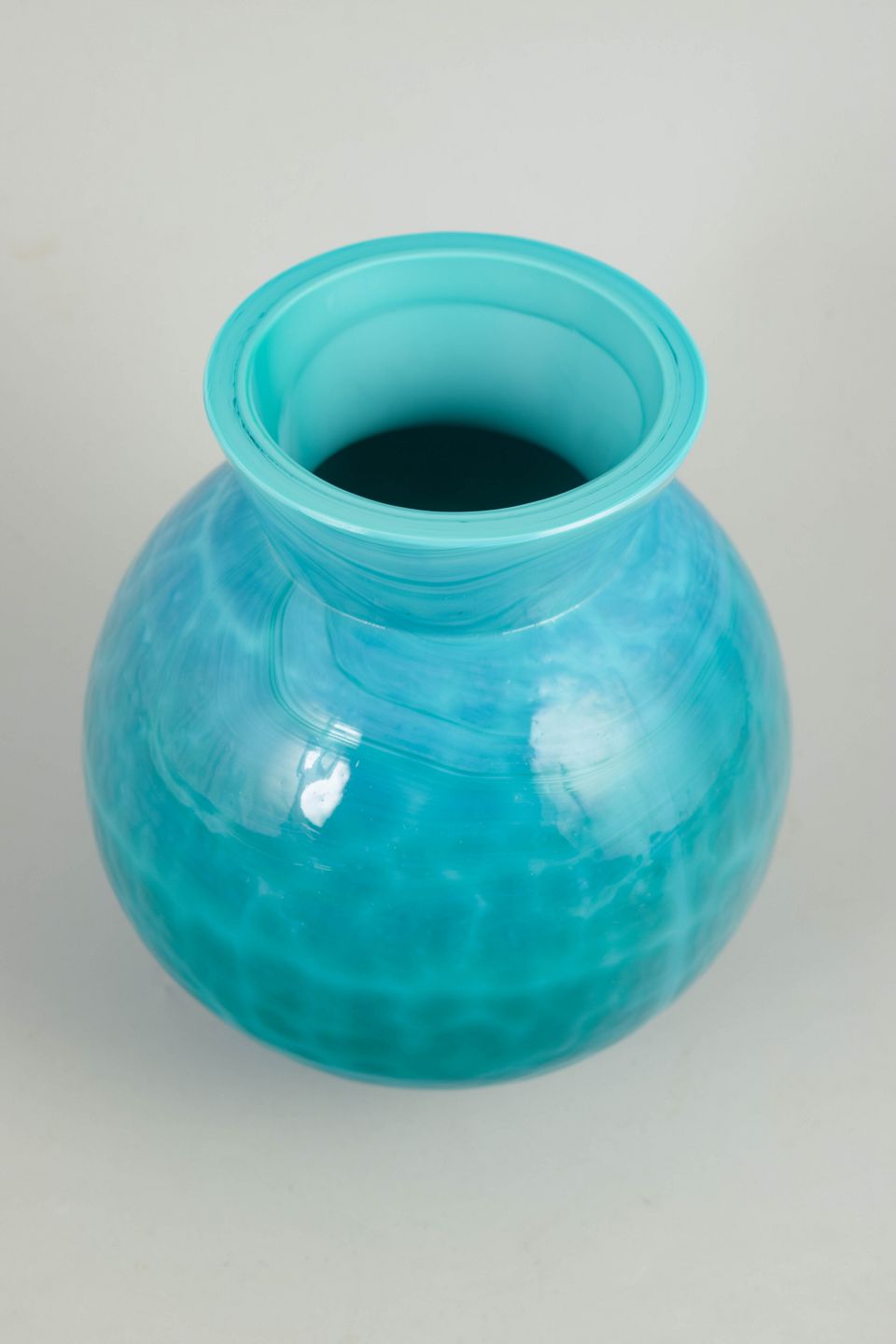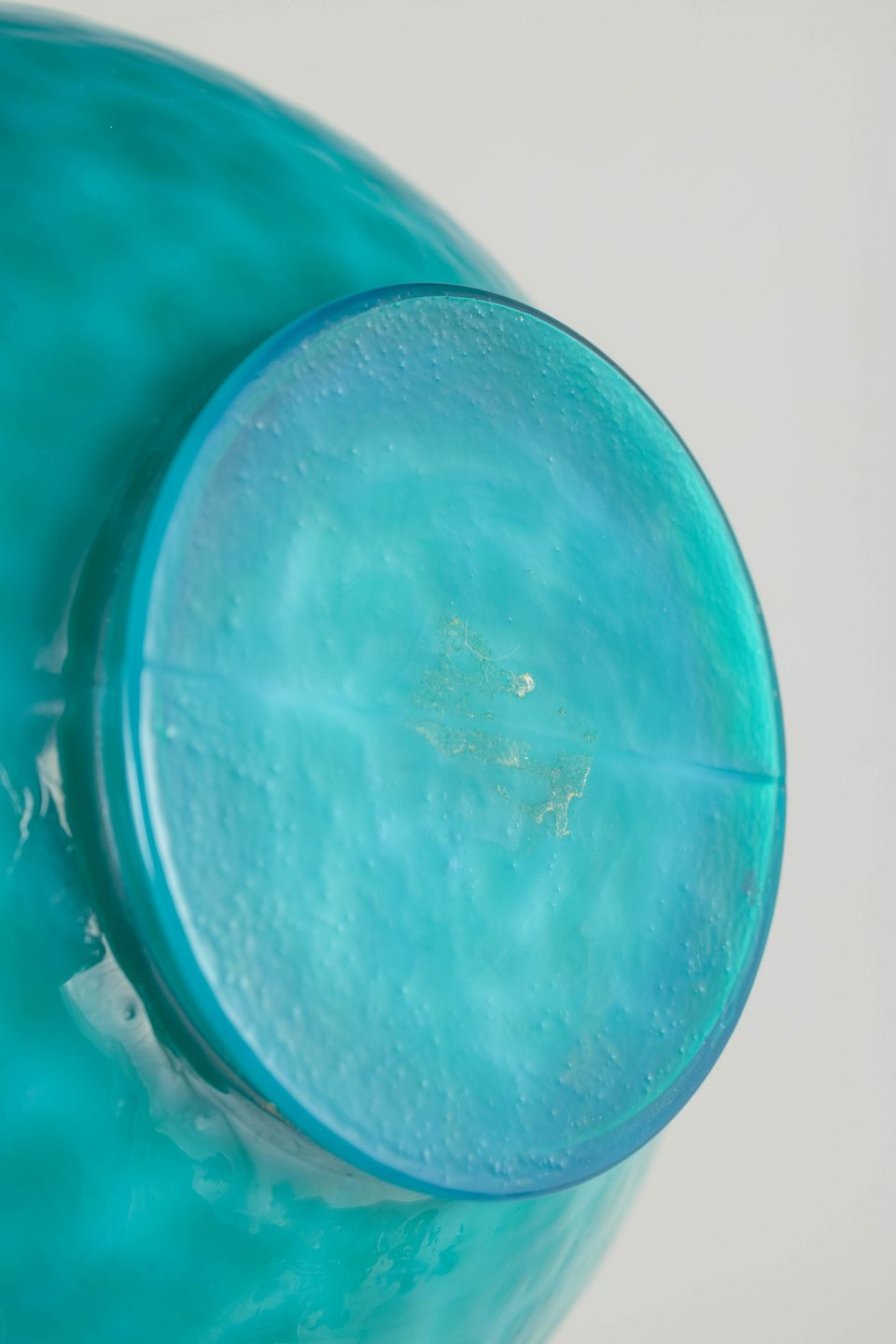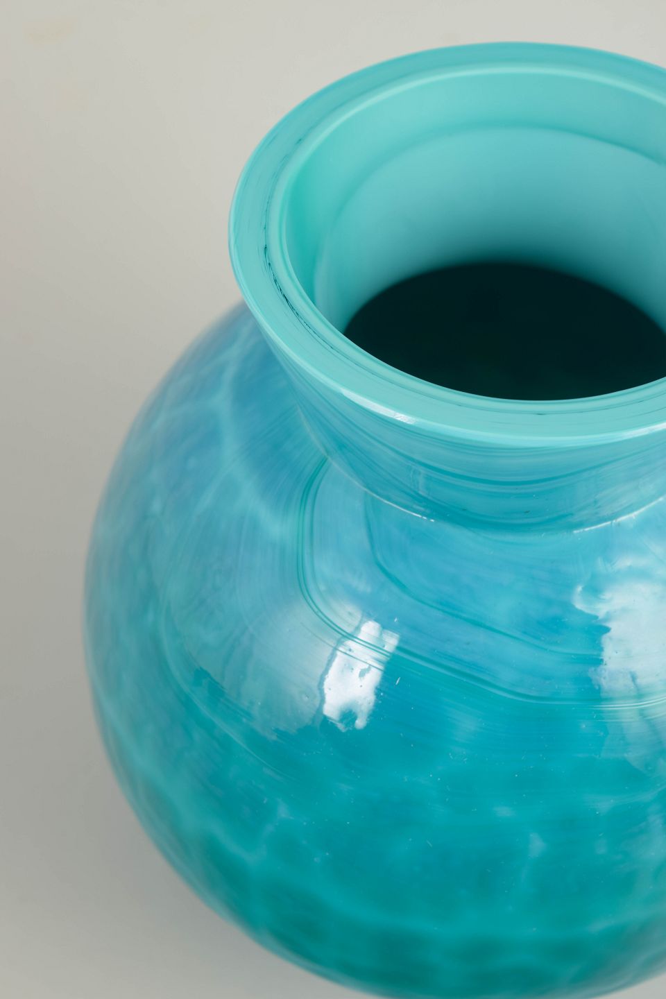 Rundbuget vase i turkisblåt kunstglas med levende, hvirvlende farvespil og blankpoleret overflade. Udført i serien “Malanit” med karakteristisk blød silhuet og let udadbøjet hals, typisk for svensk glasdesign fra 1980’erne.