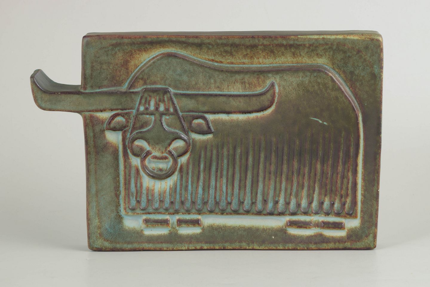 Relief i stentøj med stiliseret dyremotiv i lavt relief, udført i karakteristisk nordisk formsprog. Glasur i dæmpede jordtoner med grønne og brune nuancer, typisk for Höganäs’ produktion i perioden.
