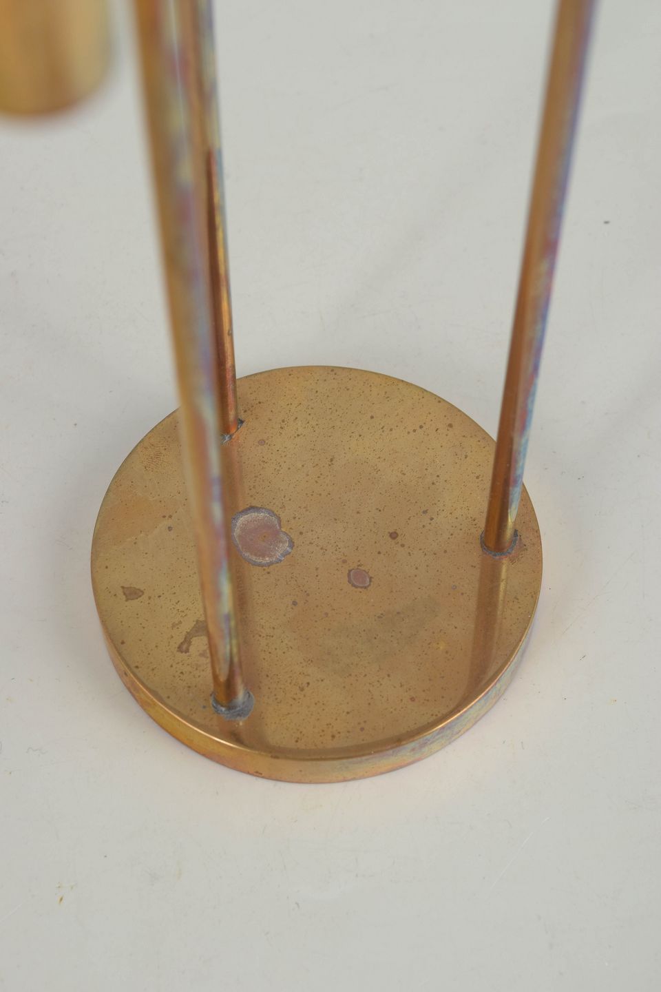 Skulpturel trearmet lysestage i massiv messing med slanke, vertikale arme i varierende højde. Stramt og elegant modernistisk formsprog, tydeligt forankret i nordisk design fra 1960’erne.