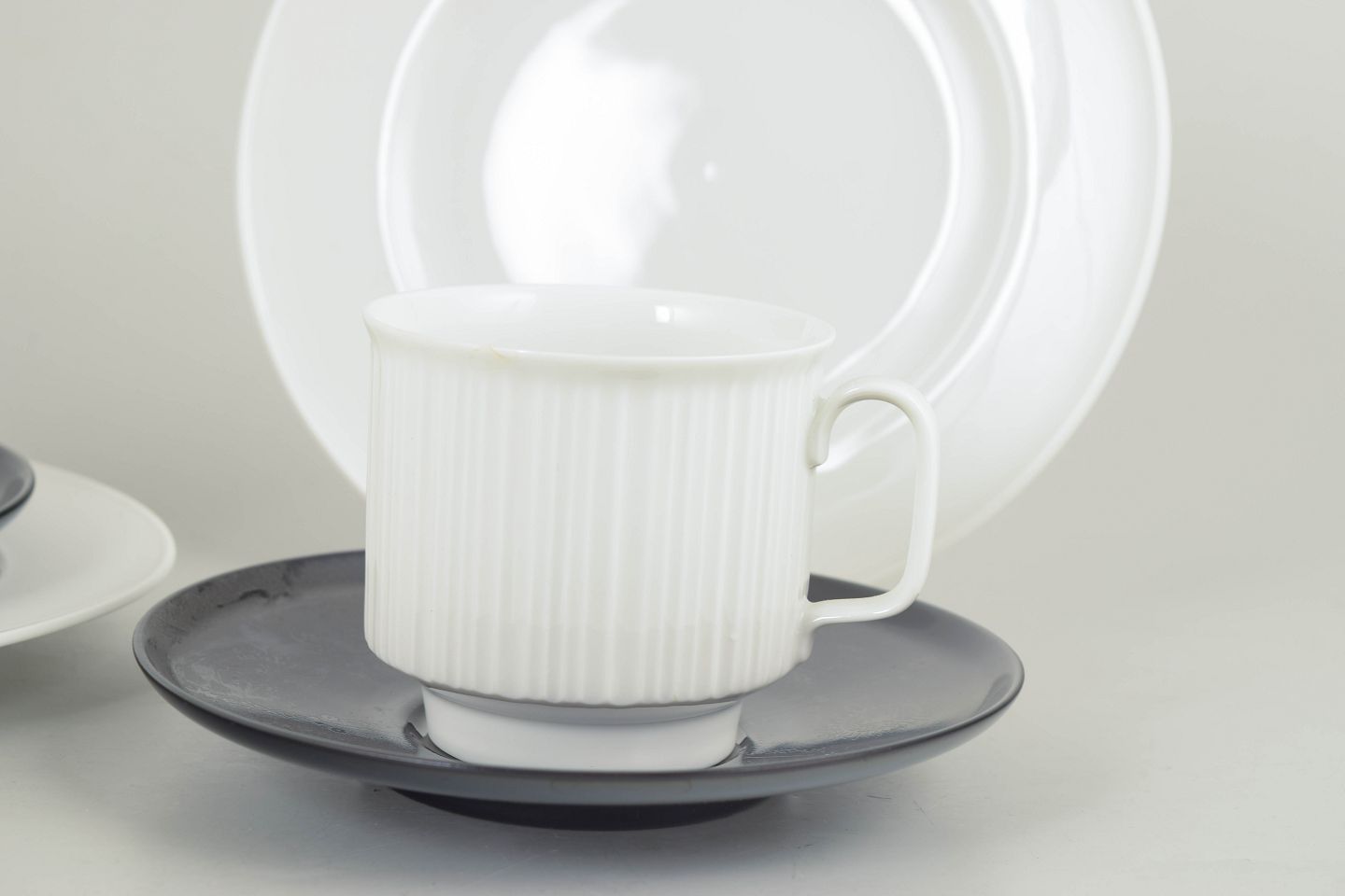 Sæt bestående af to kaffekopper i hvidt porcelæn med karakteristisk rillet overflade, hver med tilhørende underkop i kontrasterende glasur, samt to matchende kagetallerkener. Et funktionelt og stramt formsprog med tydelig nordisk modernistisk karakter.
