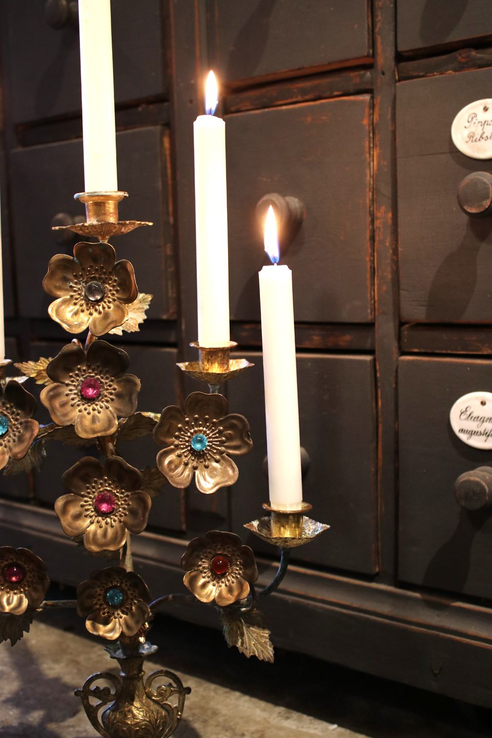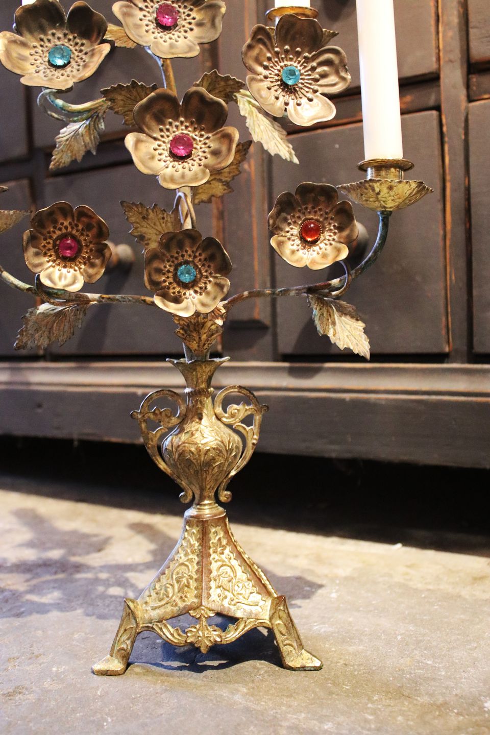 Antik Fransk kirkestage dekoreret med masser af forgyldte blomster med farvet glassten...