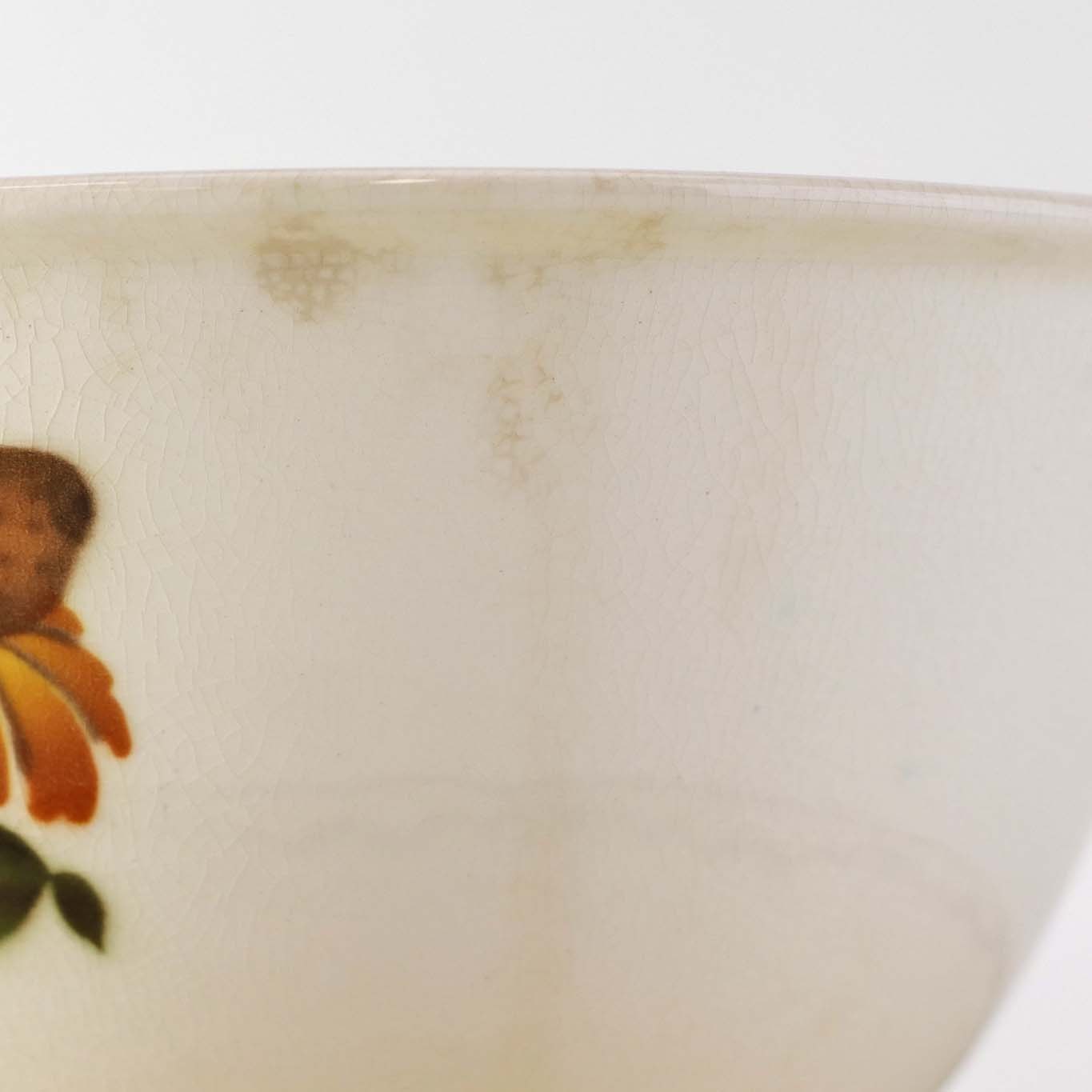 Fremstår med krakkeleringer samt steder med bruneringer under glasuren.