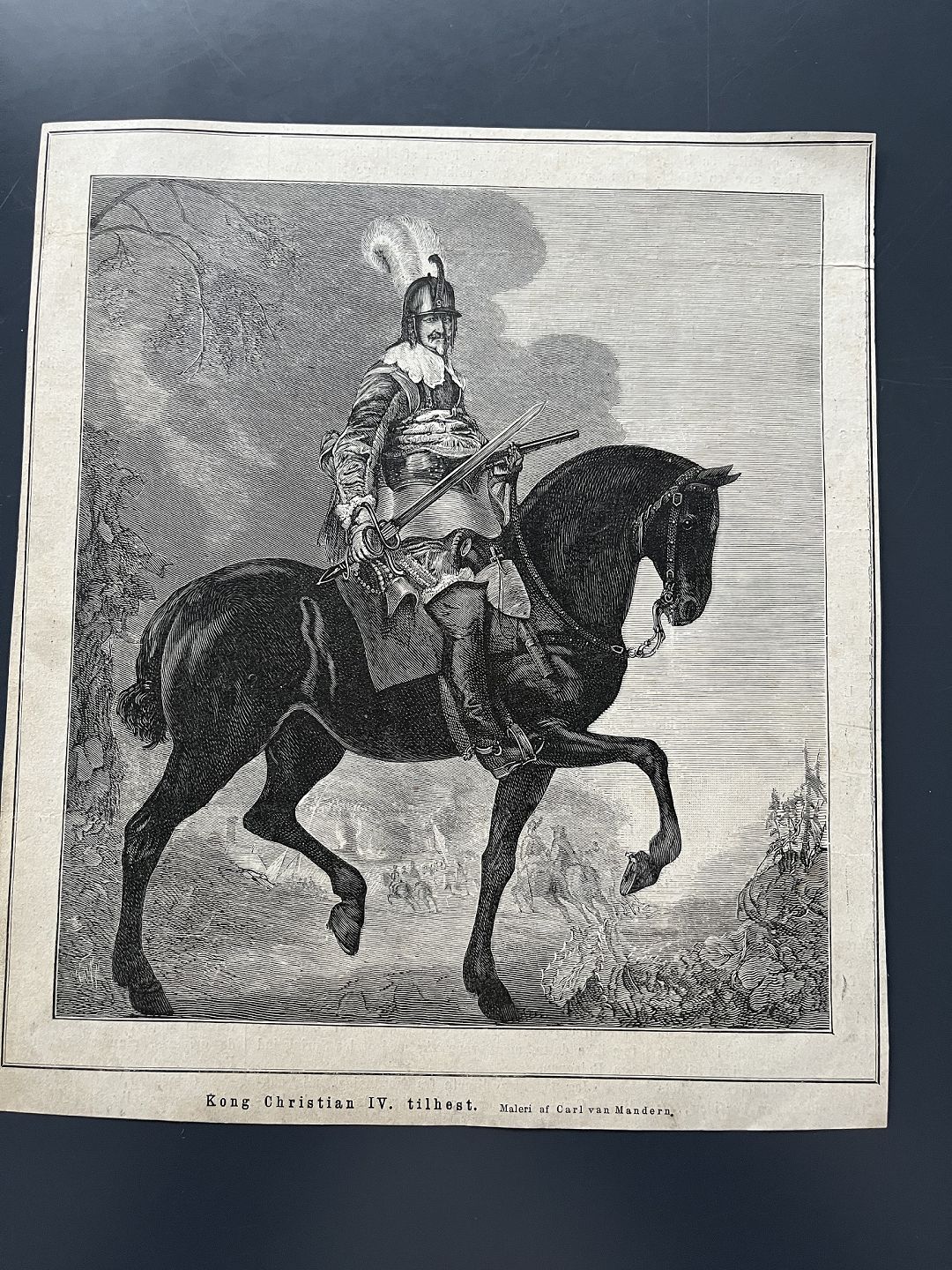 Text available in Danish: Xylografi af Frederik Hendriksen - HM Kong Christian IV til hest efter maleri af Karel van Mander.