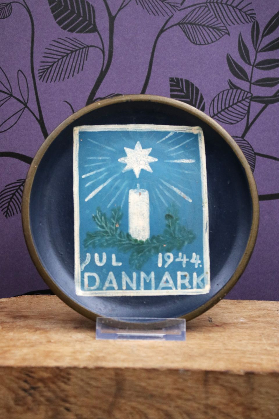 Gammel terrakotta tallerken / platte med bemalet motiv af julemærket fra Julen 1938...