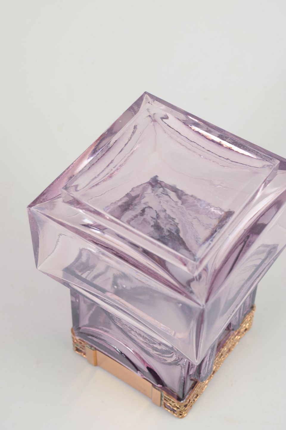 Skulpturel vase i lys violet mundblæst kunstglas med markant geometrisk form og dekorativ metalbort ved åbningen. Designet kombinerer massiv, facetteret glasopbygning med en fin, gennembrudt metalramme, hvilket skaber en tydelig kontrast mellem tyngde og lethed.
