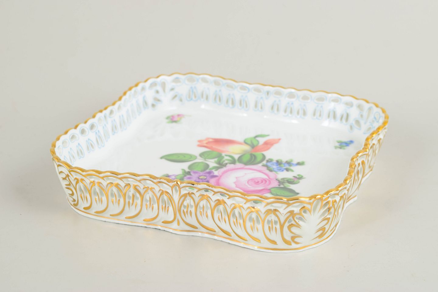 Håndmalet serveringsfad i glaseret porcelæn med blomstermotiv i rosa, grønne og blå nuancer. Kvadratisk form med bølget, profileret kant og rigt forgyldt dekoration langs randen.