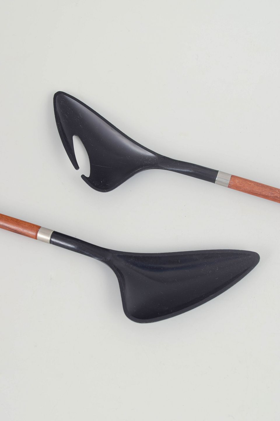 Elegant salatsæt i moderne dansk design med slanke skafter i eksotisk træ og organiske, sortformede serveringshoveder. En let og skulpturel helhed, velegnet til både hverdagsbrug og borddækning. Mærket “Denmark”.