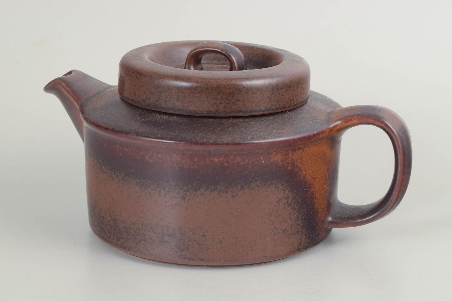 Compact stoneware teapot by Arabia from the Ruska series, finished in the distinctive mottled brown glaze in warm earth tones. Low cylindrical body with an integrated spout, broad handle and a flat lid with loop handle.