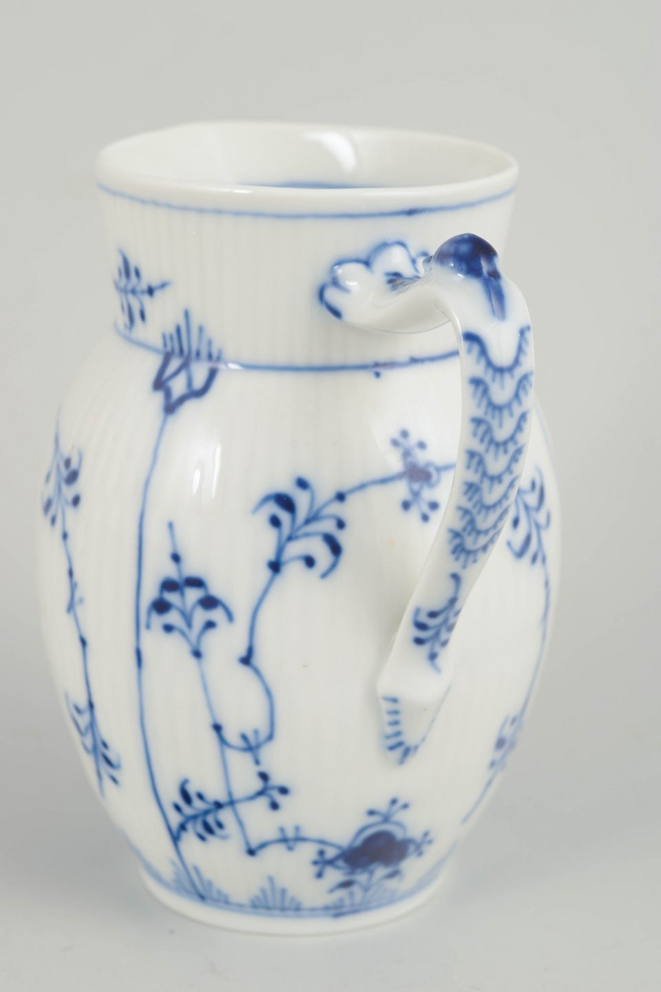 Rillet flødekande i glaseret porcelæn med håndmalet underglasurdekoration i koboltblå. Klassisk balusterform med svunget hældetud og dekorativ hank. Model 1/459. 1980´erne.