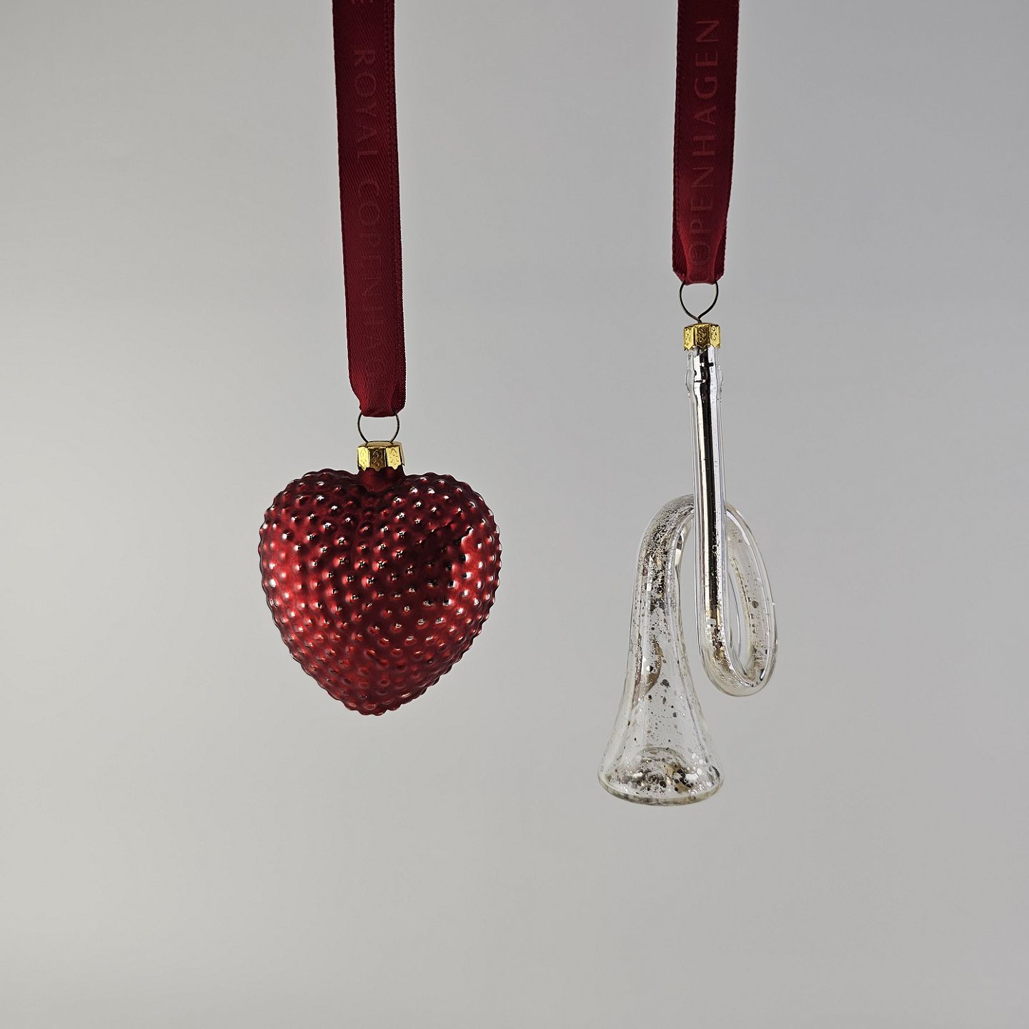 Juleornamenter i glas med motiv af et hjerte og en trompet med rødt bånd til ophæng