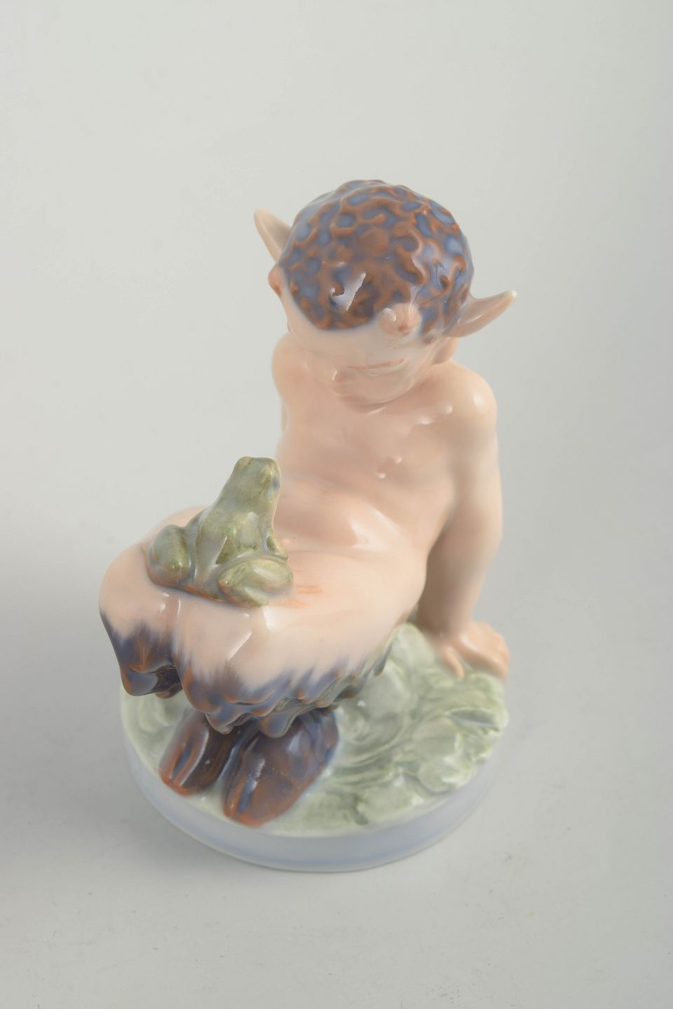Figur i glaseret porcelæn forestillende en faun og frø siddende på en base med naturalistisk modellering og bløde farveovergange i afdæmpede pasteller. Model 1713.