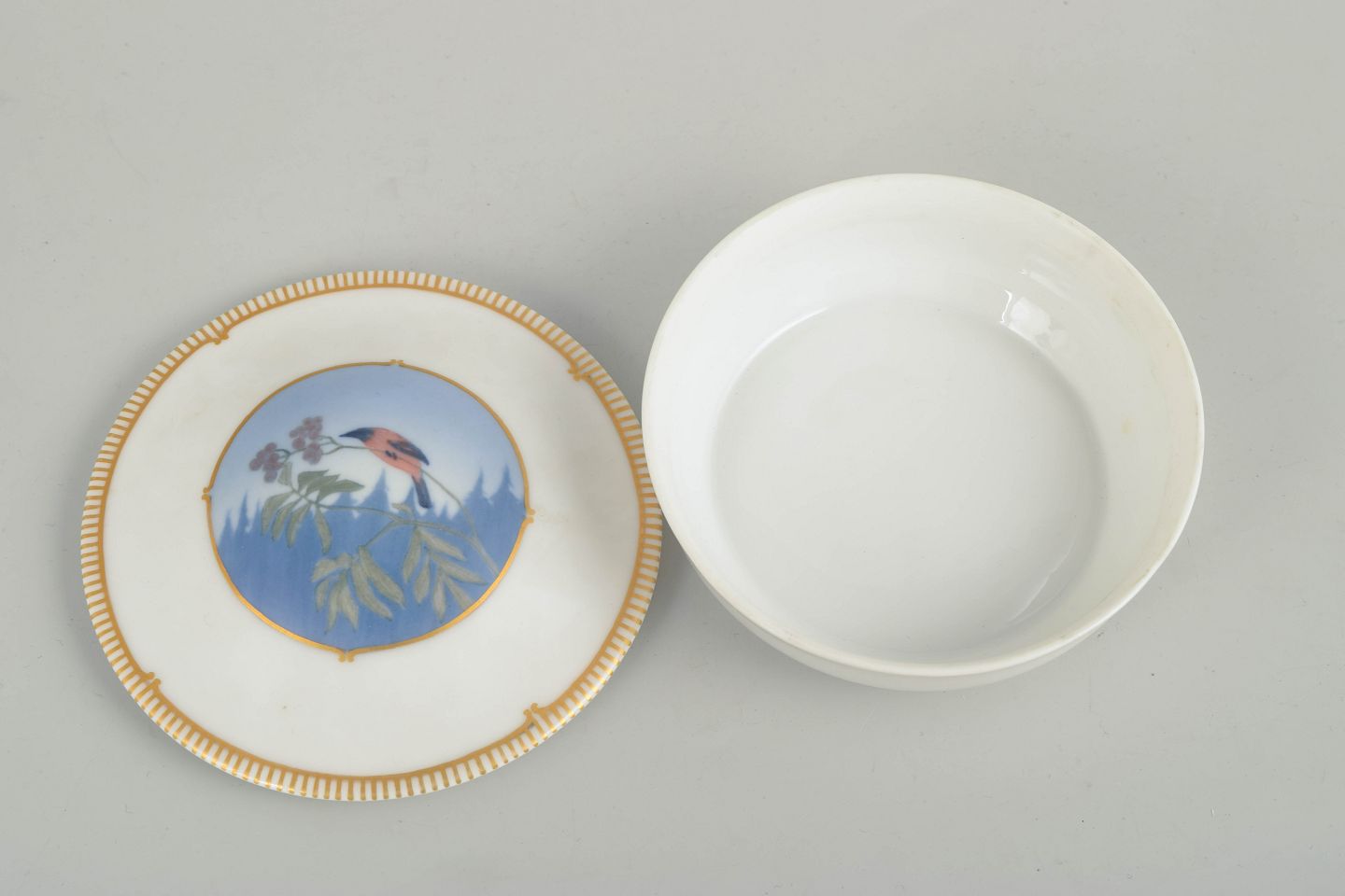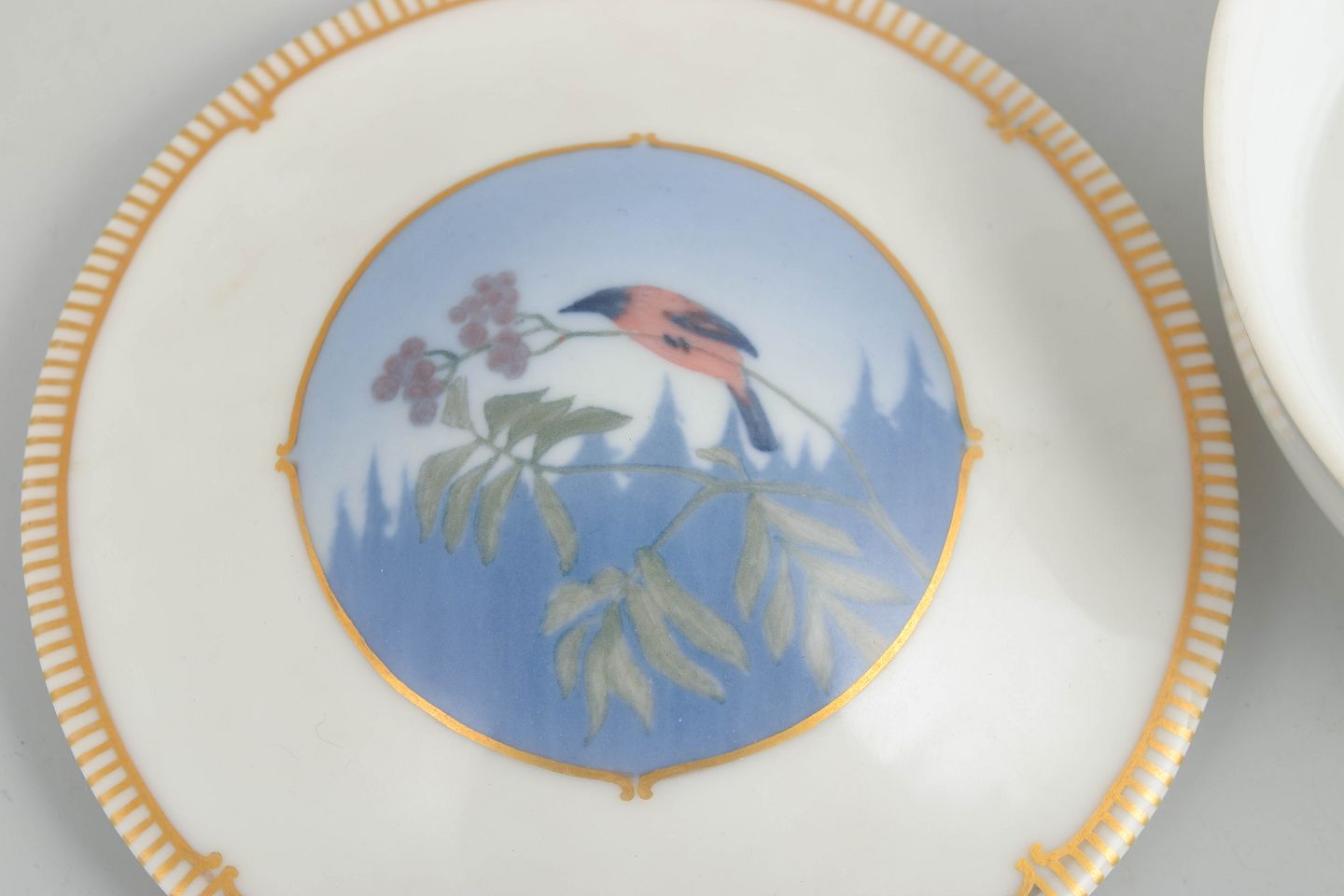 Art Deco lågskål i hvidglaseret porcelæn med bred guldkant og centralt felt med håndmalet fugledekoration i blå og grønne nuancer. 1. sortering. Model 1340/2.