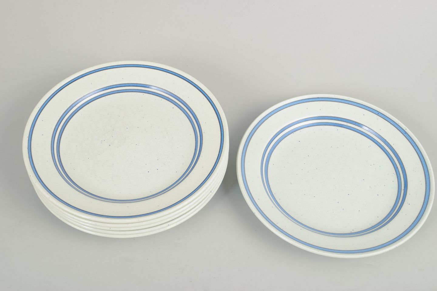 Sæt af salattallerkener i fajance med enkel, rund form og diskret dekoration i blå linjer på lys bund. Tallerkenerne er udført i Gustavsbergs “Dart”-serie, kendetegnet ved sit stringente og grafiske udtryk, som er typisk for Stig Lindbergs produktion i perioden.