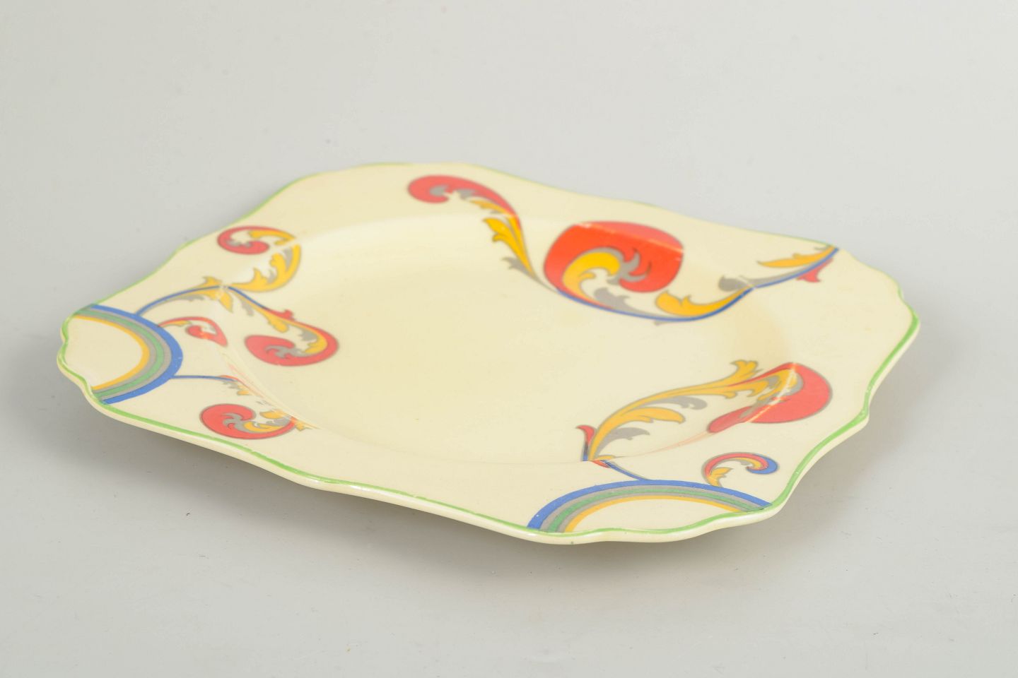 Art deco-fad i fajance med håndmalet dekoration i “Syren”-serien. Fadet har let firkantet form med blødt bølget kant og et levende, stiliseret blomstermotiv i klare, kontrasterende farver, karakteristisk for Clarice Cliffs dekorative formsprog.