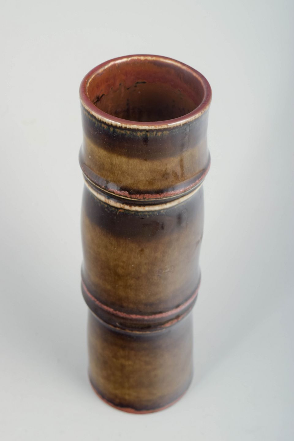 Slank, cylindrisk vase i stentøj med markant lodret formopbygning og let profilerede ringe. Overfladen er dækket af levende, løbende glasurer i varme brune, ravfarvede og beige nuancer med tydelig dybde og variation, karakteristisk for Rörstrands kunstneriske stentøjsproduktion i 1970’erne.