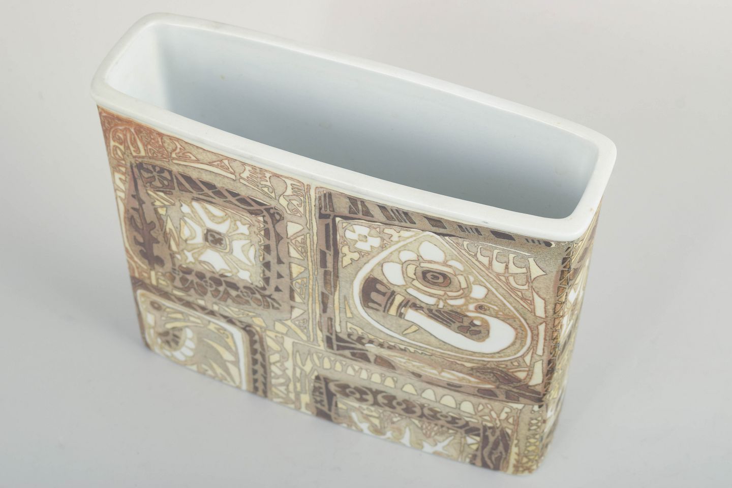 Rektangulær vase i fajance med reliefdekorerede felter og karakteristisk geometrisk ornamentik i afdæmpede jordfarver og lyse kontraster. Vasen er udført i Nils Thorssons velkendte formsprog fra Baca-serien, med tydelig inspiration fra arkæologiske og grafiske motiver. Overfladen har en markant taktil struktur, hvor dekorationen er integreret i formen og skaber et harmonisk helhedsudtryk. Model 719/2942.
